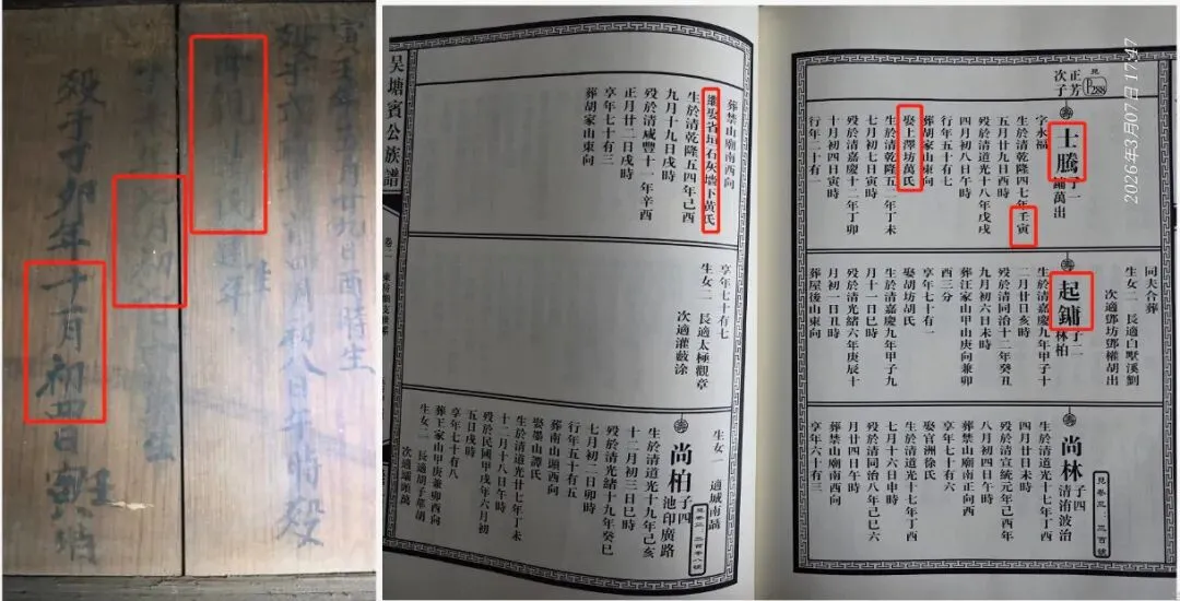 这套家谱并非纸质典籍,而是直接书写在衣柜门壁之上,毛笔繁体字迹清晰可辨,虽历经岁月侵蚀,边缘略有磨损,但核心信息完整无损,真实记录了梧岗村吴塘东房第十九代士腾公一脉的传承,时间跨度涵盖清代乾隆至民国初年,距今已逾二百年。