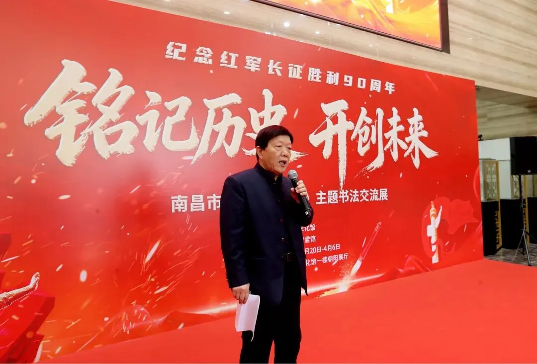 在热烈的掌声中,承办方代表、康勤国藏雪馆馆长康勤国先生登台致辞。作为一名在陕西统计系统工作三十余年的老党员,康勤国先生首先向南昌市文化馆表达了最诚挚的感谢:“正是你们的盛情邀请和精心组织,才使得这些来自全国各地的墨宝,有机会在英雄城与广大观众见面。从前期沟通到展厅布置,从活动策划到宣传推广,南昌市文化馆的各位领导和工作人员付出了大量心血。这份对红色文化的热忱、对书法艺术的支持,让我深深感动。”