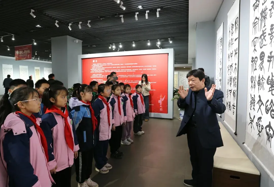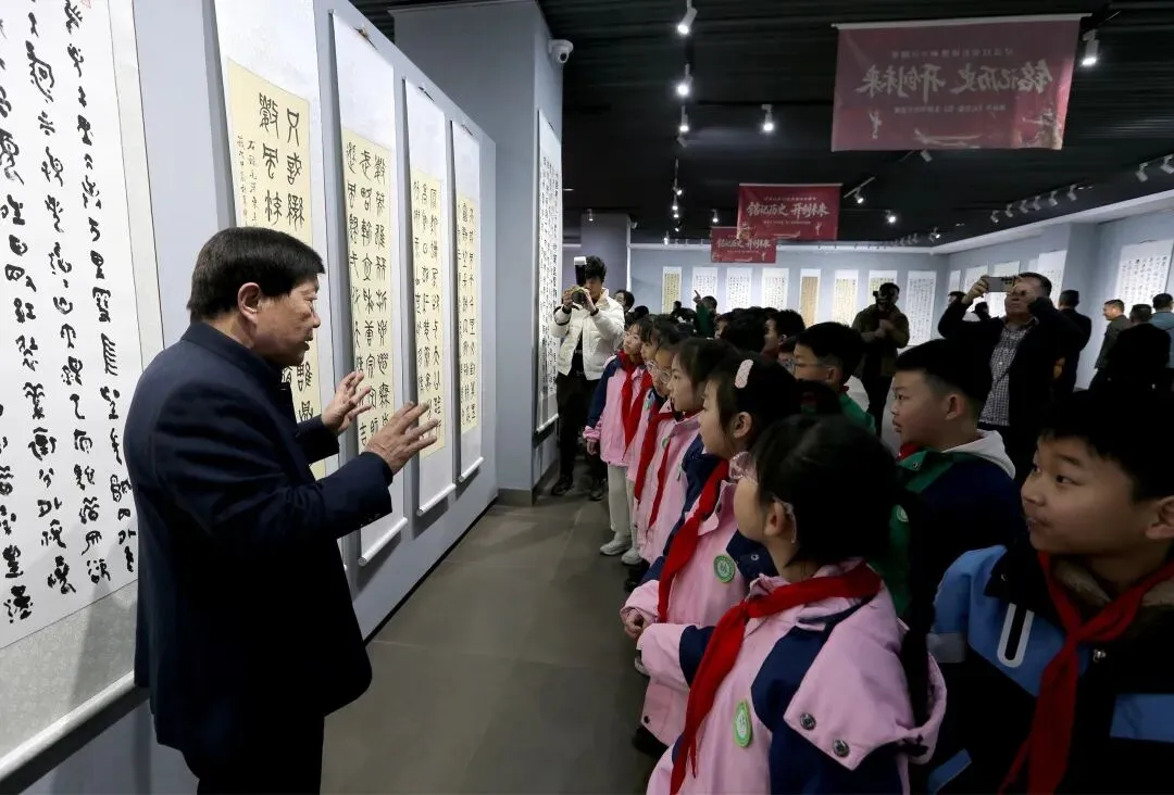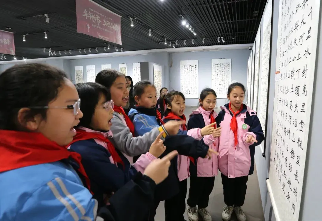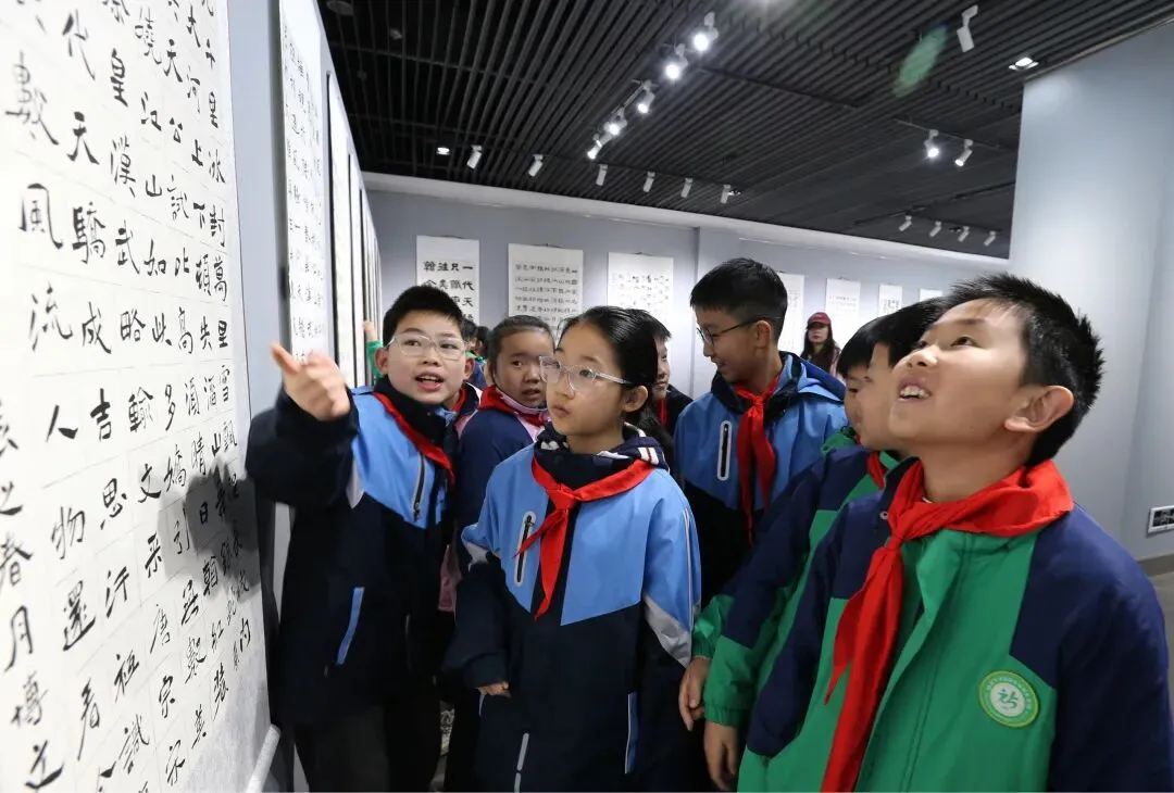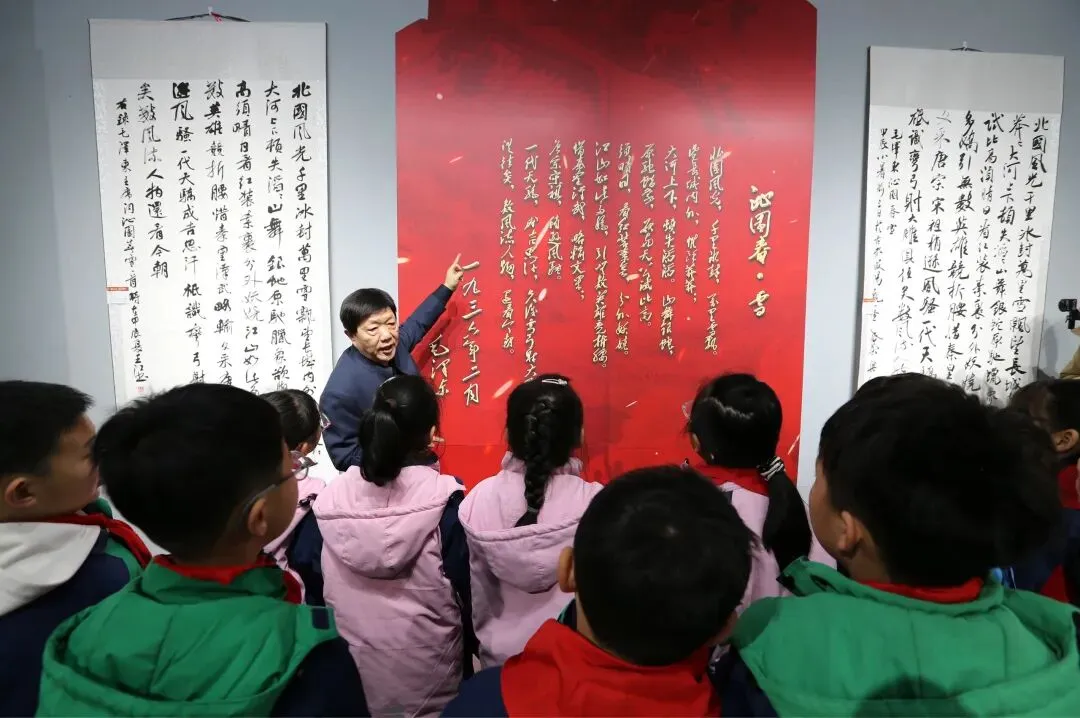 展厅内,前来参观的市民与学生络绎不绝。许多书法爱好者在名家作品前驻足品读,细细揣摩笔意;学生代表们则认真聆听工作人员的讲解,在铁画银钩间感悟那段烽火岁月的革命激情。来自江西某高校的大学生代表感慨道:“以前读《沁园春·雪》是在课本上,今天在书法作品中‘读’到了它。那一笔一画之间,仿佛能看到红军战士跋山涉水的身影,能感受到那份‘欲与天公试比高’的英雄气概。”