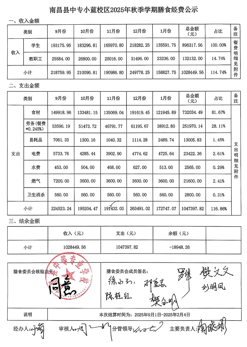 为进一步加强学校膳食经费管理,提高经费使用透明度,保障师生饮食安全与营养健康,依据《江西省中小学校园安全和膳食经费管理操作指南》的通知及学校财务管理规定,现将南昌县中专小蓝校区2025年秋季学期膳食经费情况公示如下: