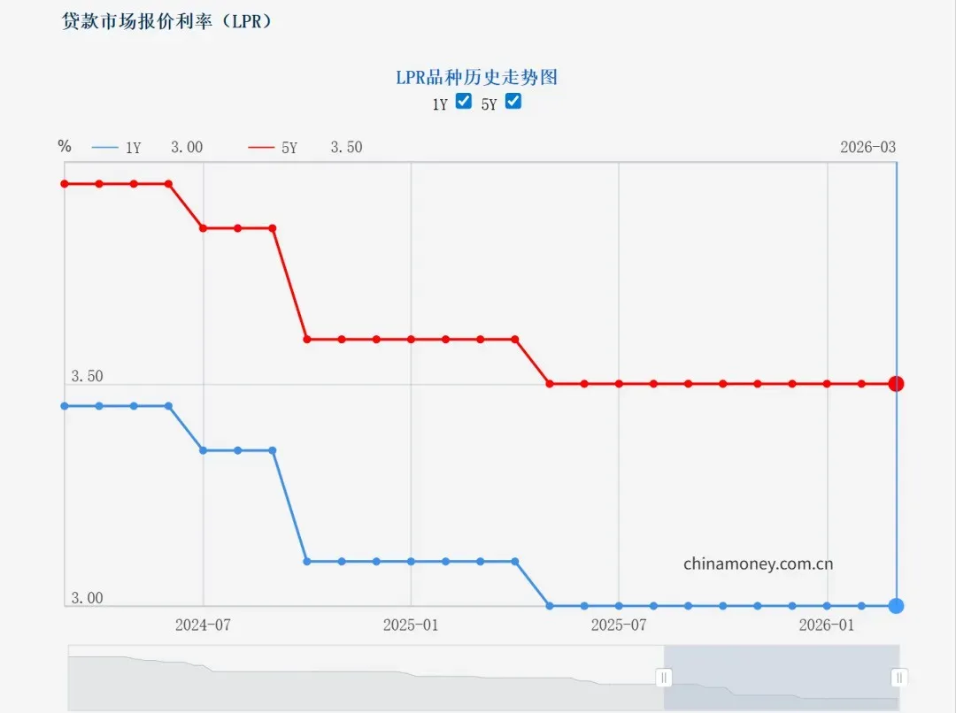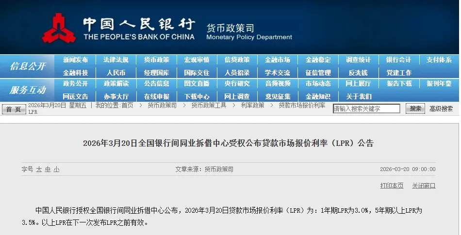 2026年3月20日贷款市场报价利率(LPR)为:1年期LPR为3.0%,5年期以上LPR为3.5%。以上LPR在下一次发布LPR之前有效。