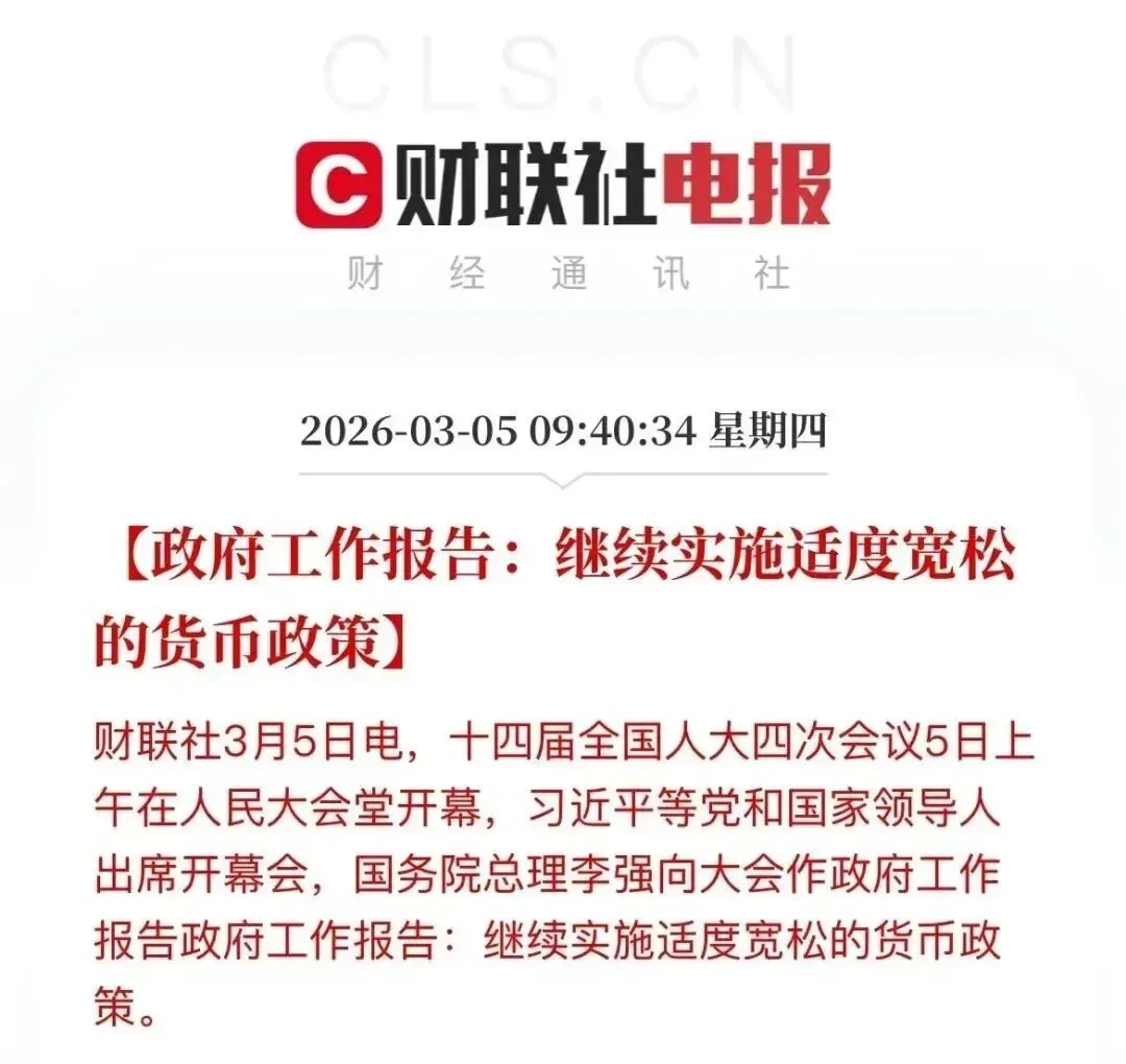 3月5日政府报告明确,继续实施更加积极的财政政策,继续实施适度宽松的货币政策。