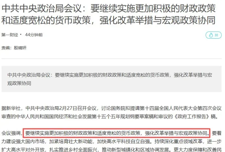 2月27日,中共中央政治局召开会议,会议强调,要继续实施更加积极的财政政策和适度宽松的货币政策,强化改革举措与宏观政策协同。