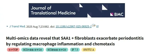 Li L, Yang Y, Dai F, Deng L, Jiang M, He C, Long T, Yang K, Yang X, Song L. Multi-omics data reveal that SAA1+ fibroblasts exacerbate periodontitis by regulating macrophage inflammation and chemotaxis. J Transl Med. 2025;23(1):882. doi: 10.1186/s12967-025-06925-1. PMID: 39762105; PMCID: PMC12330154.