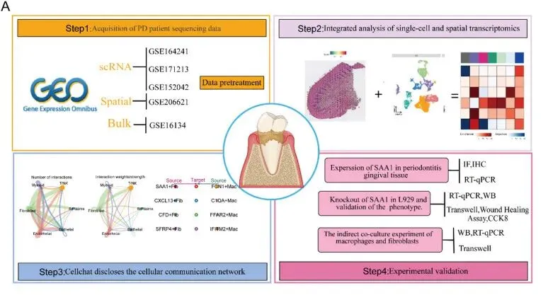 方法:整合牙周组织单细胞、空间及批量转录组数据,解析炎性牙周微环境的空间结构与细胞通讯网络,结合生物信息学和体内外功能验证,探究SAA1+成纤维细胞的促炎作用及机制。