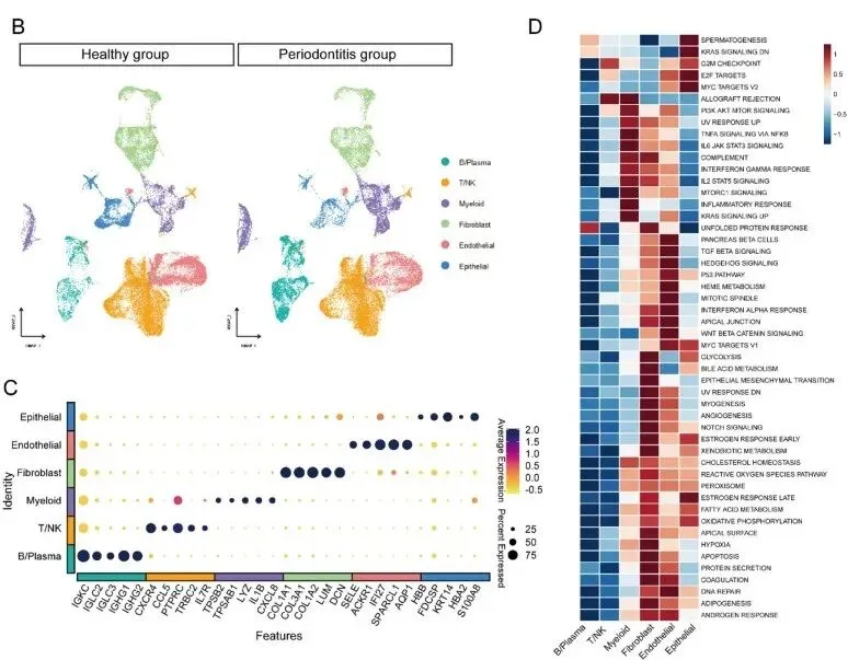 构建含65979个细胞的牙周组织单细胞图谱,分6类细胞,GSVA分析显示基质细胞富集凋亡通路、髓系细胞富集炎症通路。