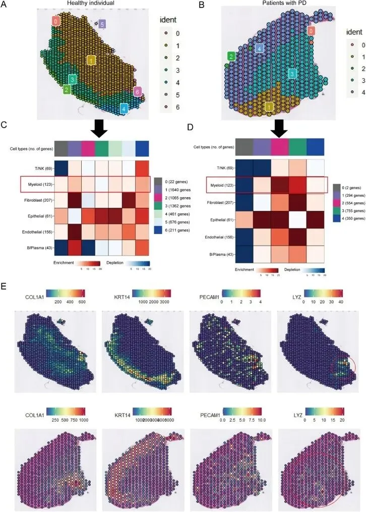 空间转录组结合MIA分析,发现牙周炎中髓系细胞向基质细胞区浸润,细胞空间分布较健康组织发生显著改变。