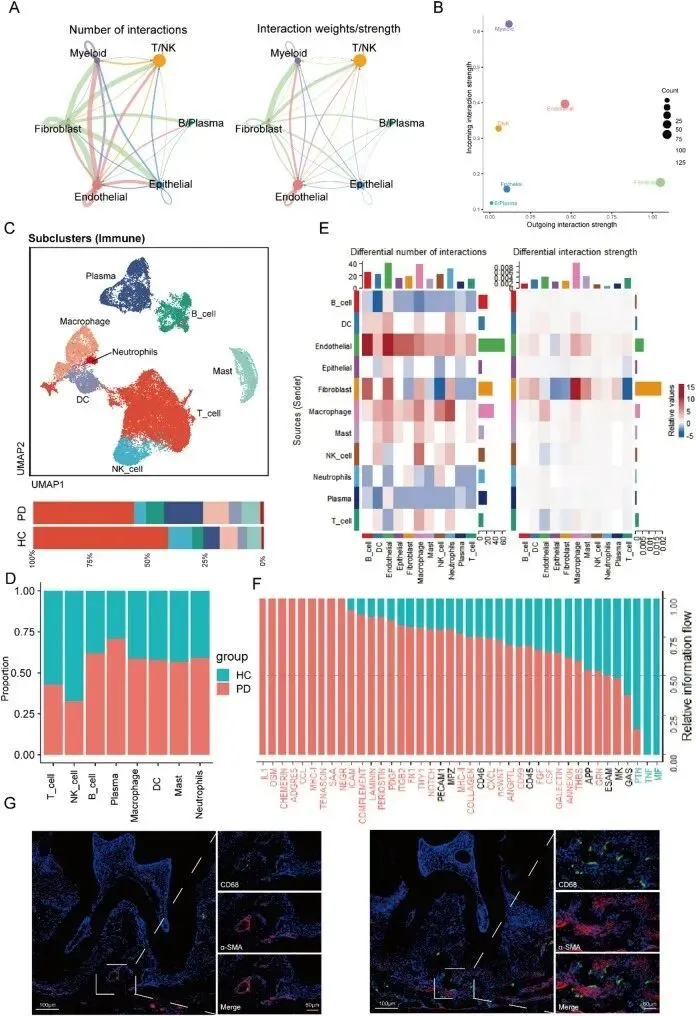 CellChat分析显示成纤维细胞是主要信号发送者、髓系细胞为主要接收者,牙周炎中成纤维细胞与巨噬细胞互作显著增强。