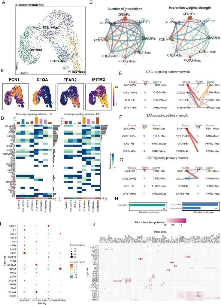 构建二者互作网络,发现SAA1+Fib通过CXCL/SAA/CSF通路向巨噬细胞发信号,CSF1-CSF1R轴在牙周炎中显著激活。