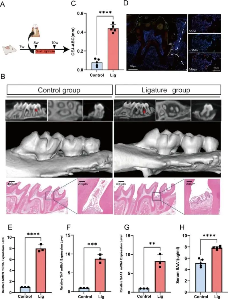 结扎法构建小鼠牙周炎模型,证实牙龈组织和血清中SAA1表达显著升高,SAA1+Fib定位于结合上皮下结缔组织。