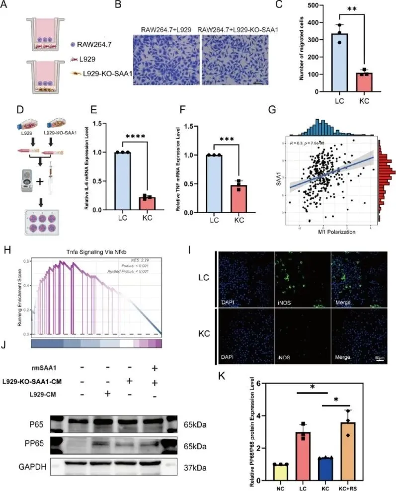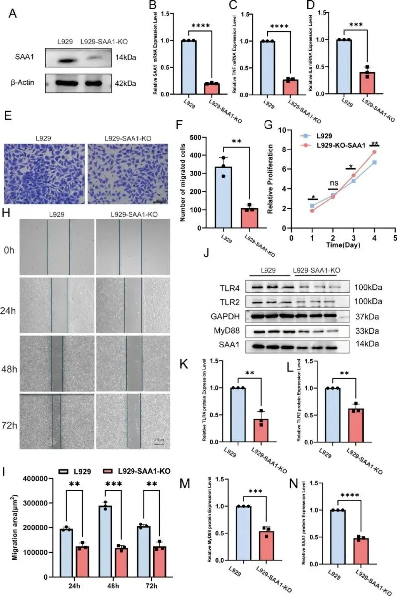 敲除SAA1后L929细胞炎症因子分泌减少、迁移能力下降,且通过TLR4/TLR2/MyD88通路调控炎症反应。