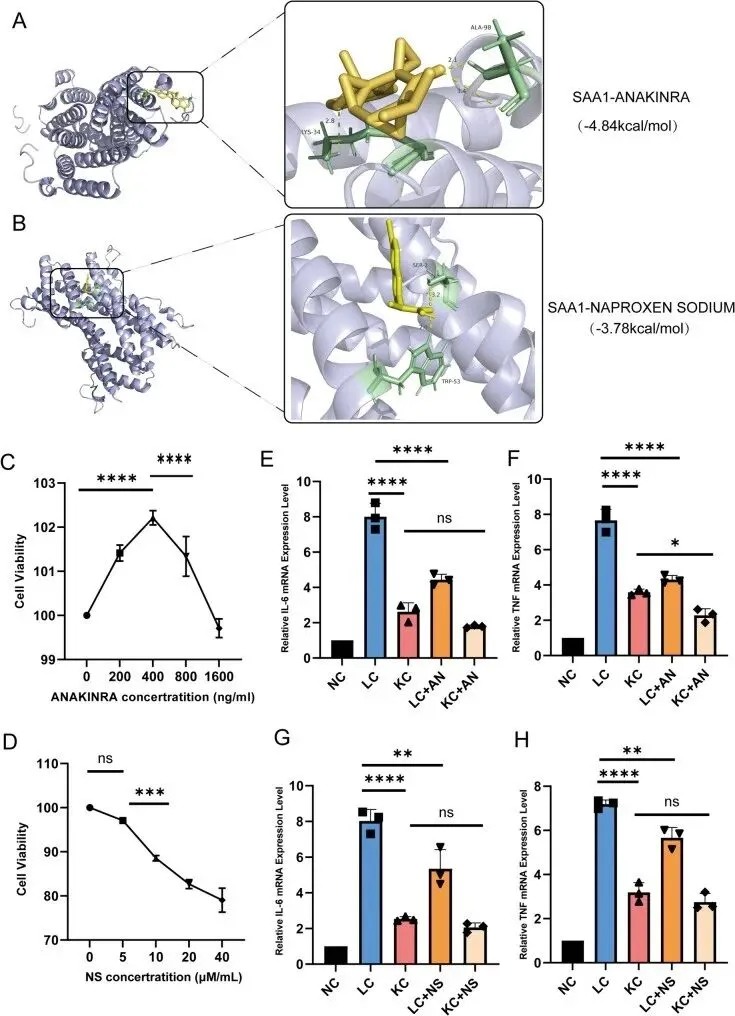 筛选出Anakinra和萘普生钠为SAA1潜在靶向药,二者可结合SAA1并显著抑制巨噬细胞中炎症因子的表达。