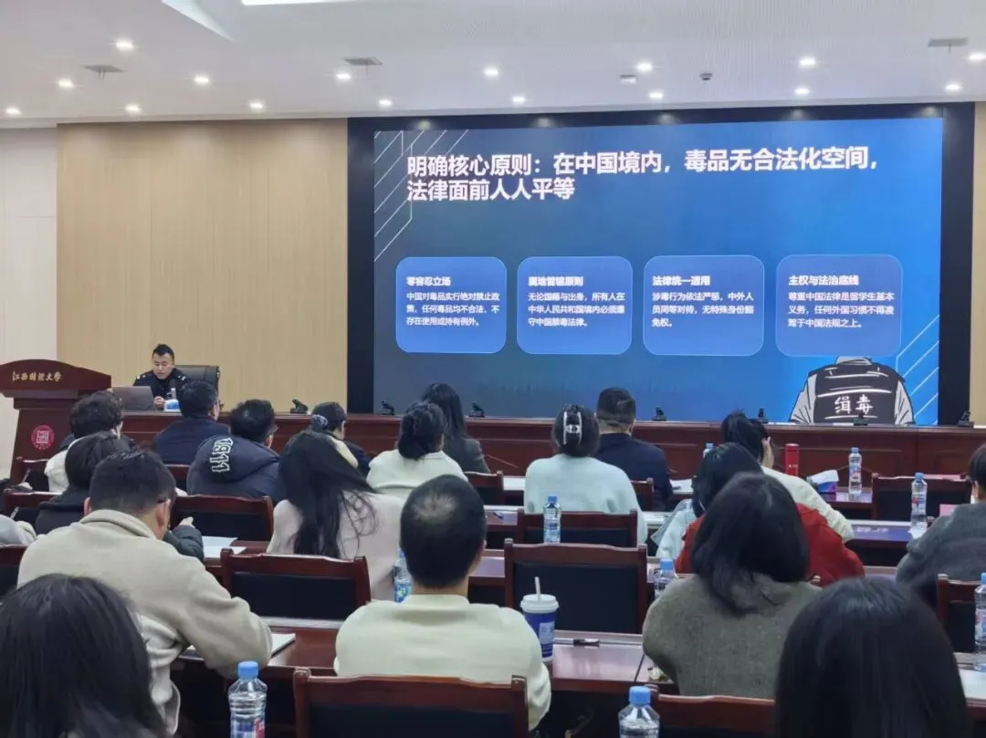 为进一步加强在昌高校留学生的毒品预防教育工作,提升留学生管理老师的识毒、防毒、拒毒意识和禁毒业务指导能力,筑牢校园涉外安全防线,3月19日下午,南昌市公安局禁毒支队依托全市留学生管理教师公安专项业务培训班平台,在江西财经大学为来自全市22所高等院校的70余名留学生管理老师开展了禁毒专题培训。
