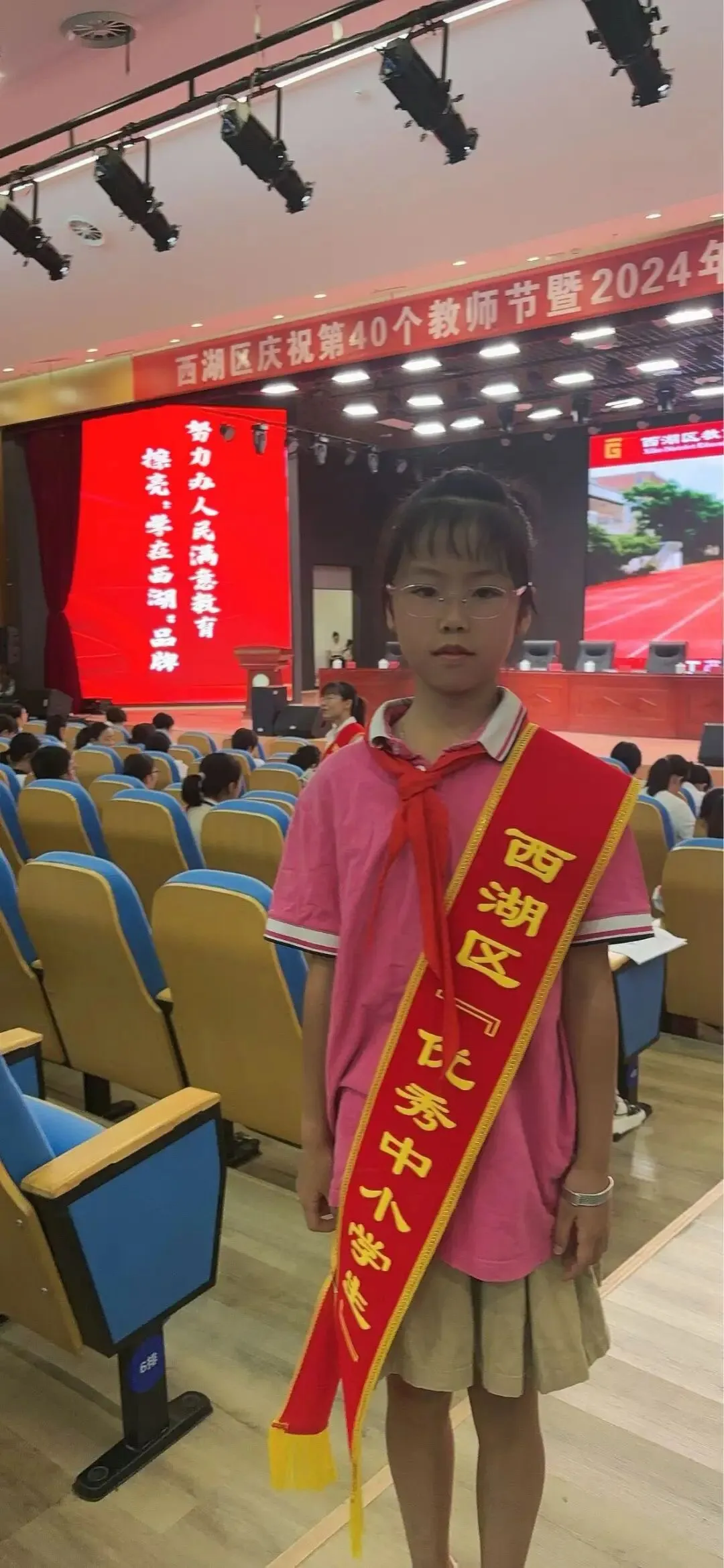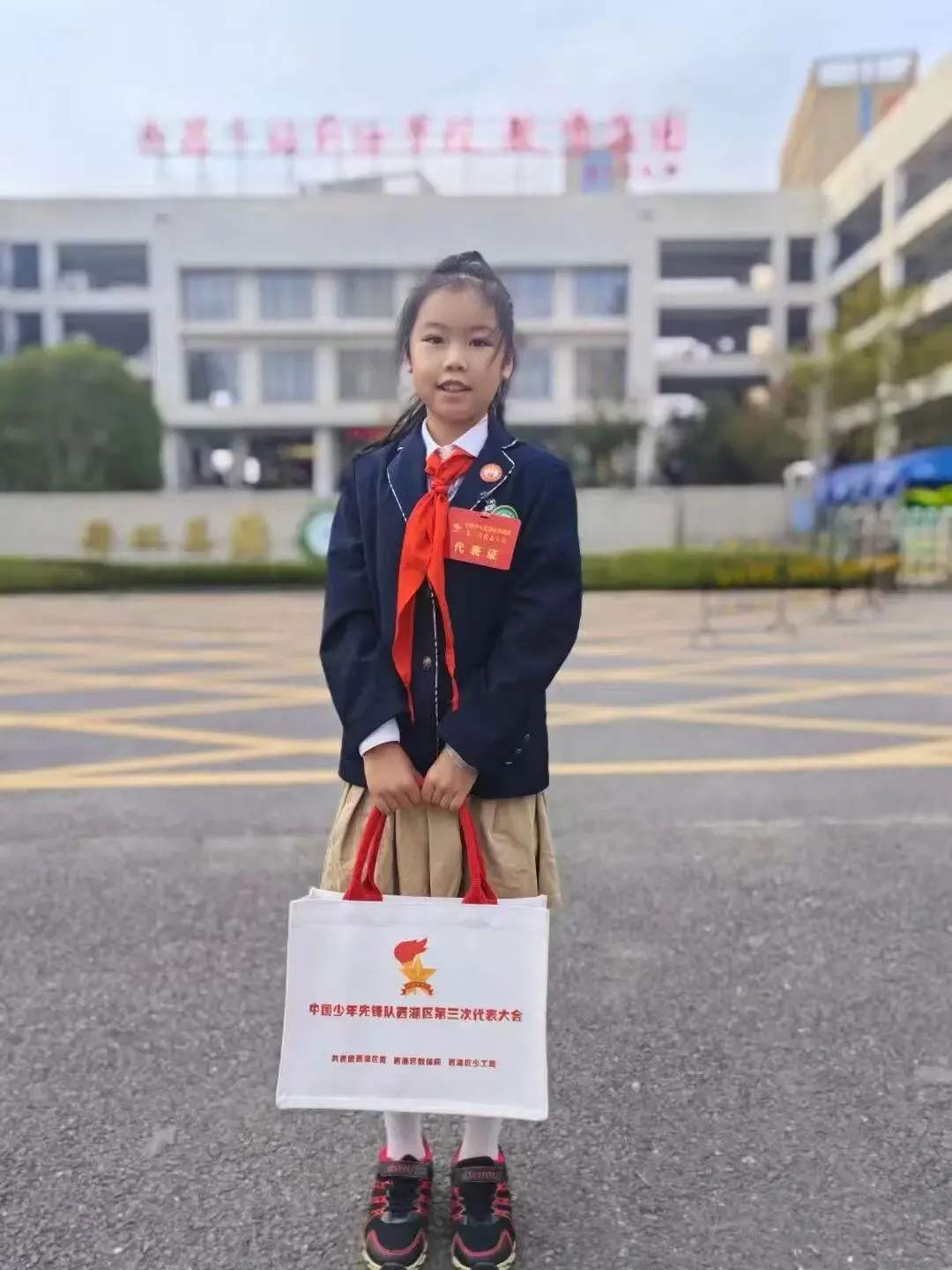 生在英雄城,长在红旗下。她从小听红色故事长大,耳濡目染间,“从小学先锋,长大做先锋”八个字,悄悄在她心里扎了根。她始终接受红色文化熏陶,将“从小学先锋,长大做先锋”作为成长信条。西湖区“铁流”红领巾志愿宣讲员的她把新四军军部旧址当成了第二个课堂,积极参与“红领巾心向党”等主题教育活动,将厚重的革命历史转化为同龄人喜闻乐见的生动故事,游客们不知道她的名字,却记住了这个讲起红色故事眼睛会发光的小姑娘。在全国青少年文化遗产知识大赛“博物馆讲解员”赛中凭借深情的讲述,将红色基因在少年儿童中薪火相传,并荣获全省二等奖。她一直把每一场讲解都做为一次心灵的洗礼,她要像“小火种”一样,把温暖和信仰种进更多人心里。