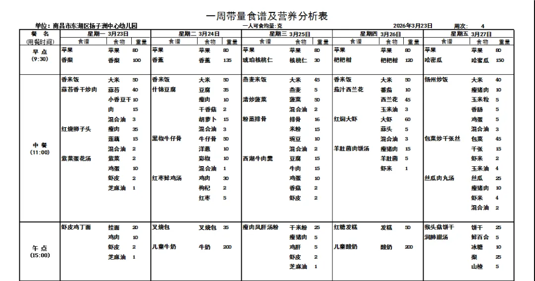 南昌市东湖区扬子洲中心幼儿园每周食谱(03月16日-03月20日)