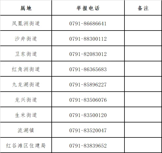 (一)本次集中整治问题实行属地管理、分级负责。请举报人优先向小区所在地的镇(街道)反映。如遇属地单位推诿扯皮、未按规定受理线索等情况,可直接向南昌市红谷滩区住建局反映。(二)举报受理采取来电方式。受理部门及工作人员将依法保护举报人合法权益,对举报人相关信息严格保密。