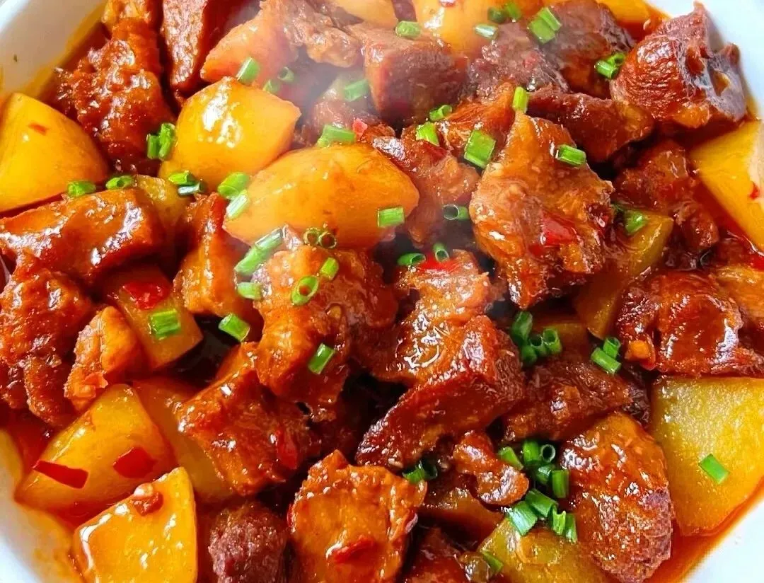 土豆炖牛肉、清炒油麦菜