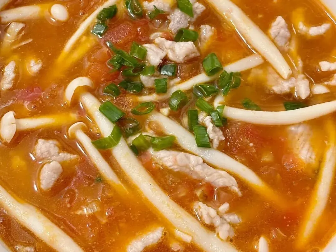 肉沫番茄菌菇蛋汤、香甜米饭