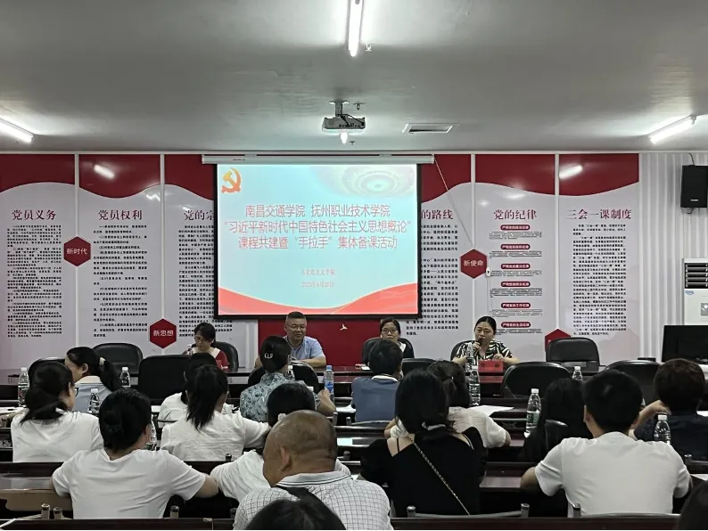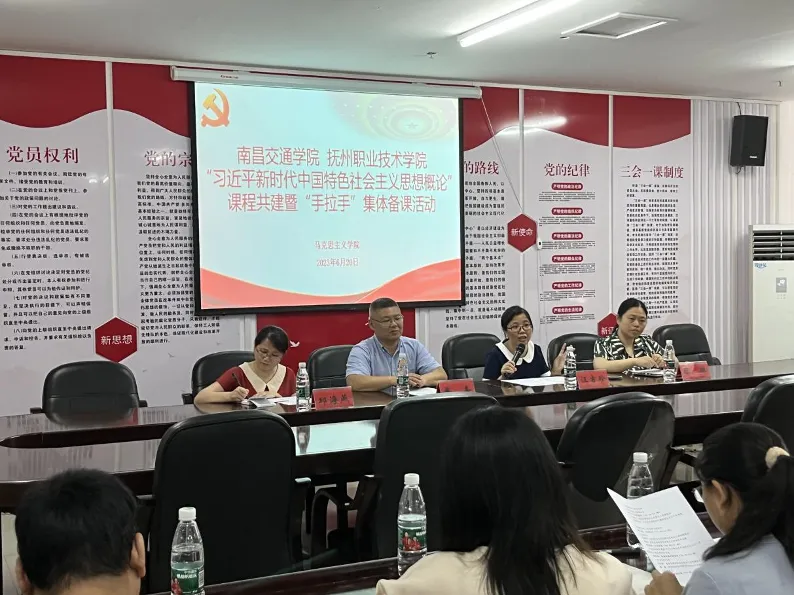 为推进学习贯彻习近平新时代中国特色社会主义思想主题教育走深走实,加强“习近平新时代中国特色社会主义思想概论”课程建设,推动思政课教学改革创新。6月20日,抚州职业技术学院马克思主义学院与南昌交通学院马克思主义学院在其黄家湖校区综合楼908会议室举行跨校“手拉手”集体备课活动。两所高校马克思主义学院院长、副院长、院长助理、各教研室主任和思政课教师参加了备课会。此次备课会由南昌交通学院马克思主义学院副院长汪吉珍主持。
