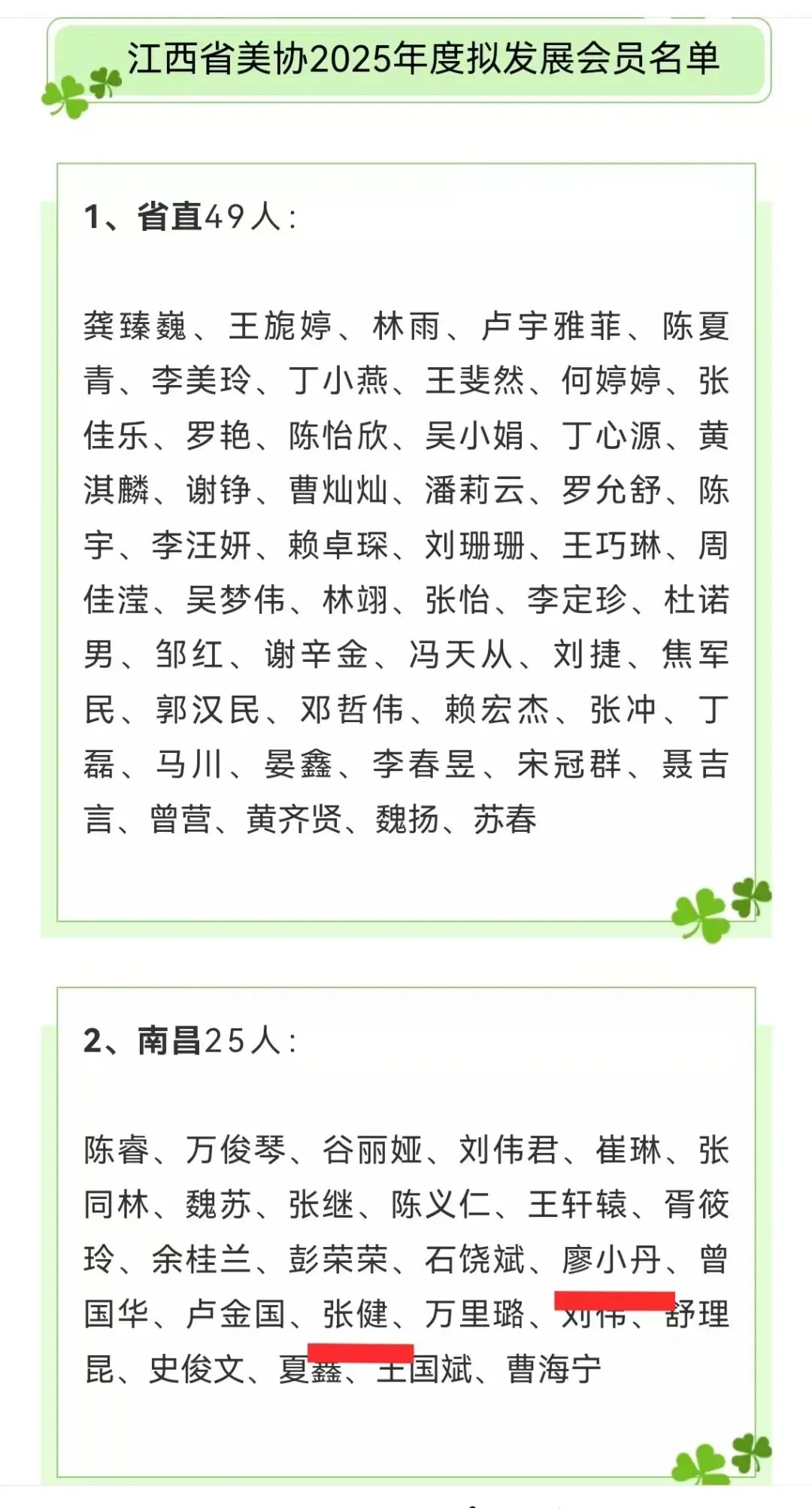 2025年度新申请加入江西省美协会员,经初审、复核、公示等工作程序和江西省美协主席团会议审核通过,共发展会员224人。其中,南昌地区南昌县美协廖晓丹、张健两位加入,特此祝贺!