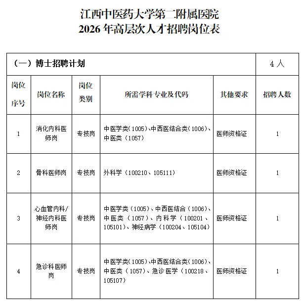 博士招聘计划共4名,具体招聘岗位及要求详见《江西中医药大学第二附属医院2026年高层次人才招聘岗位表》(附件1)。