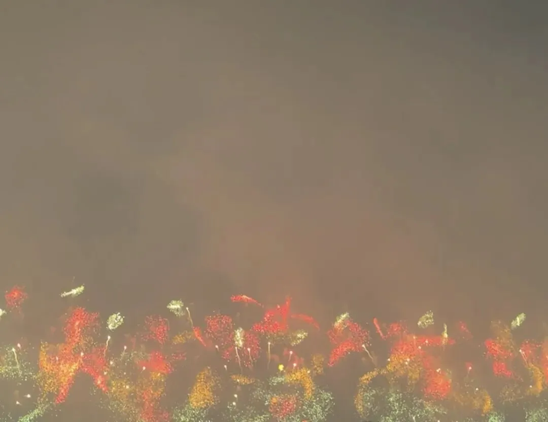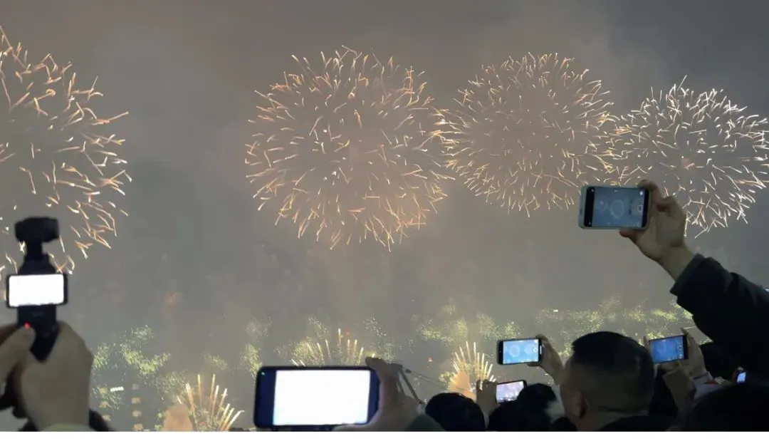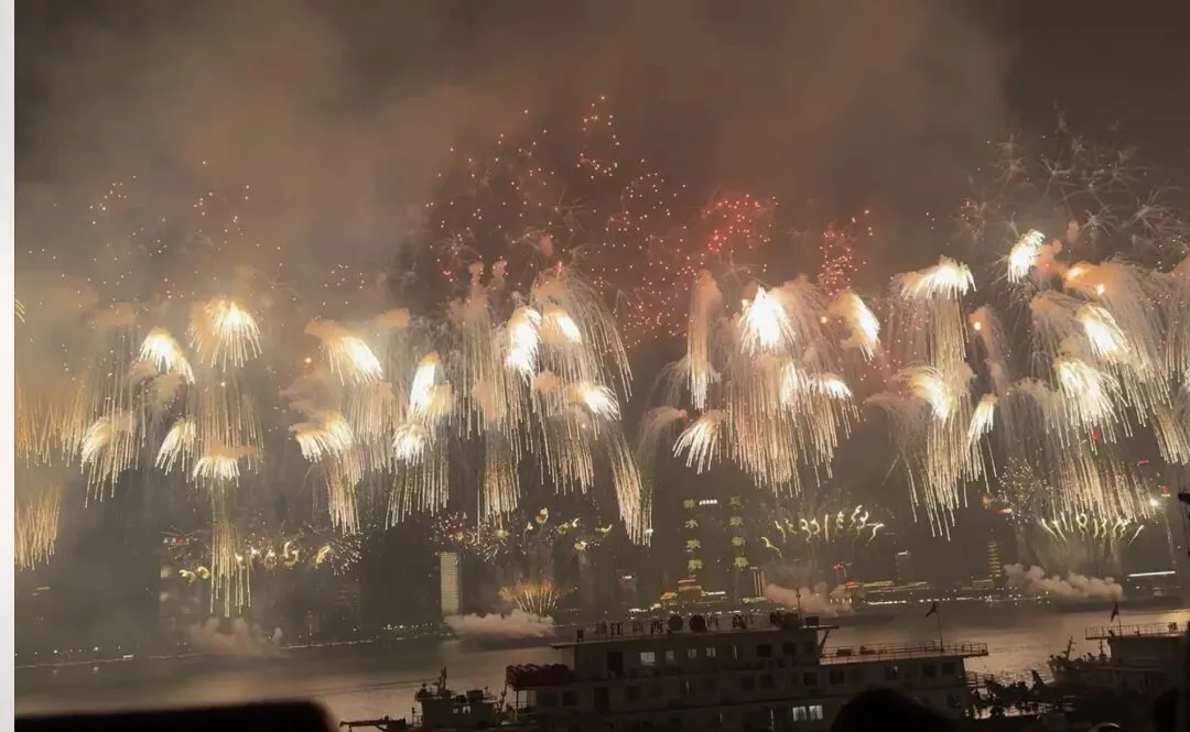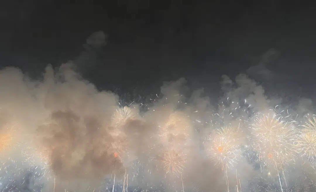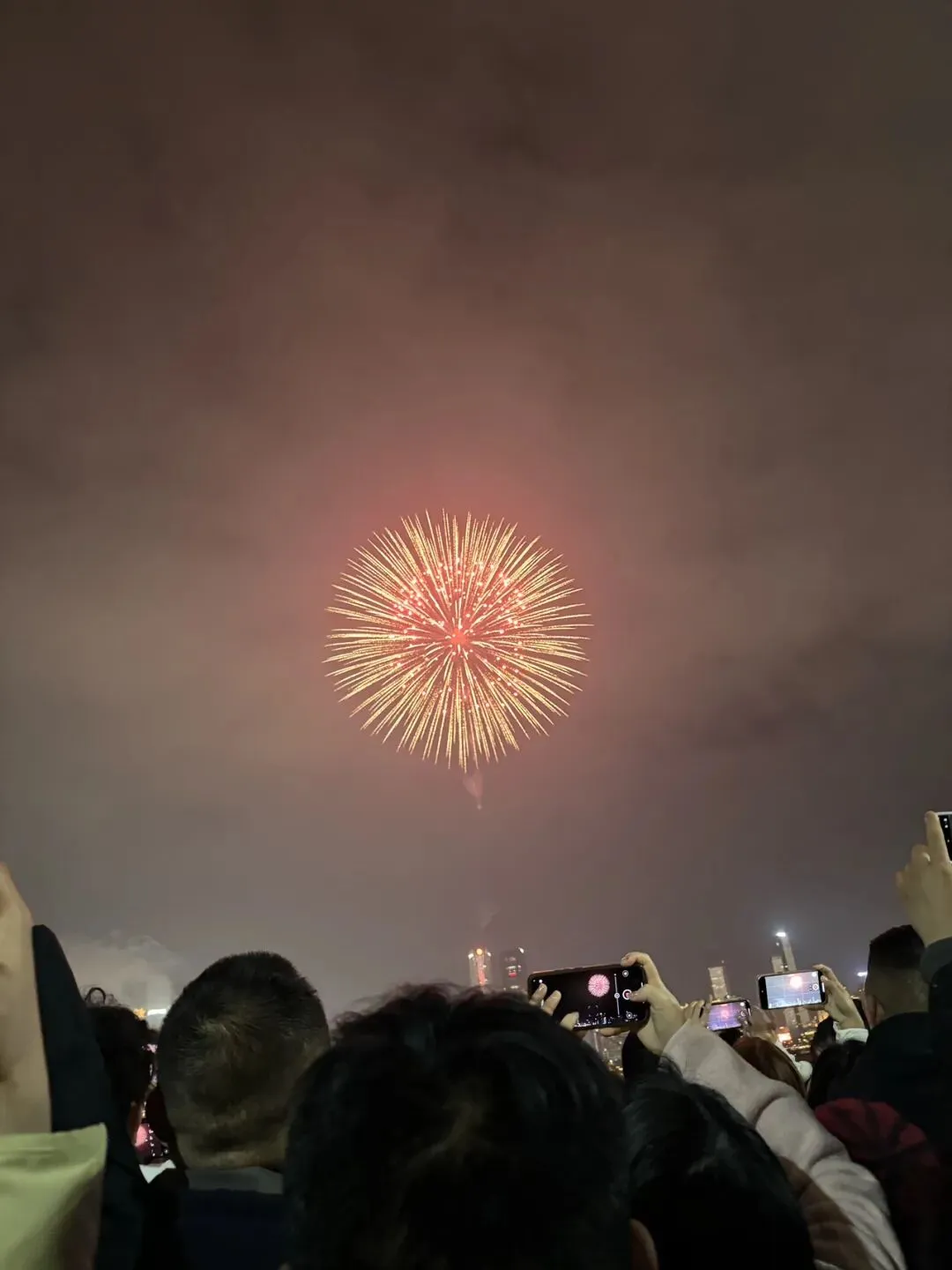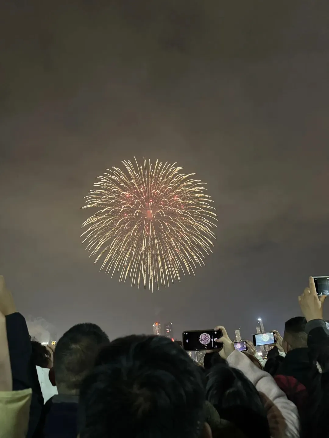 伴随着人们此起彼伏“哇”的惊呼声,远处的烟花金光四射,正如朱自清笔下的烟花:“那升腾的火焰,如同点点流萤,带着哨音,钻入那高远的苍冥。猛地,它散开了,是那样大大方方、痛痛快快地散开,像一树突然盛开的梨花,又像一挂碎了的珍珠,散落得满天都是。”