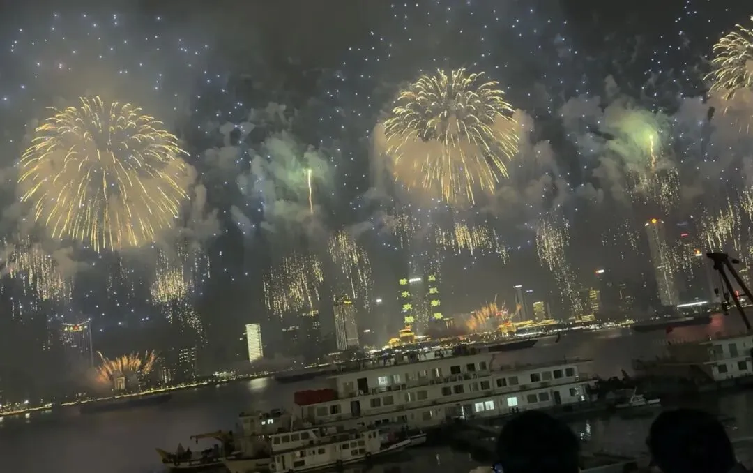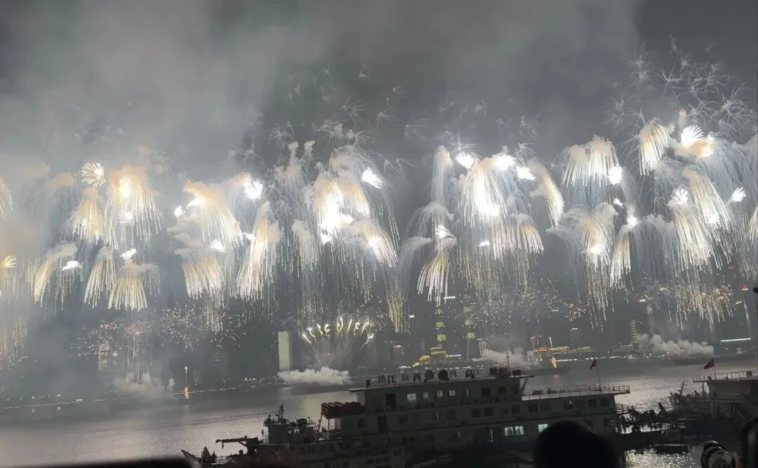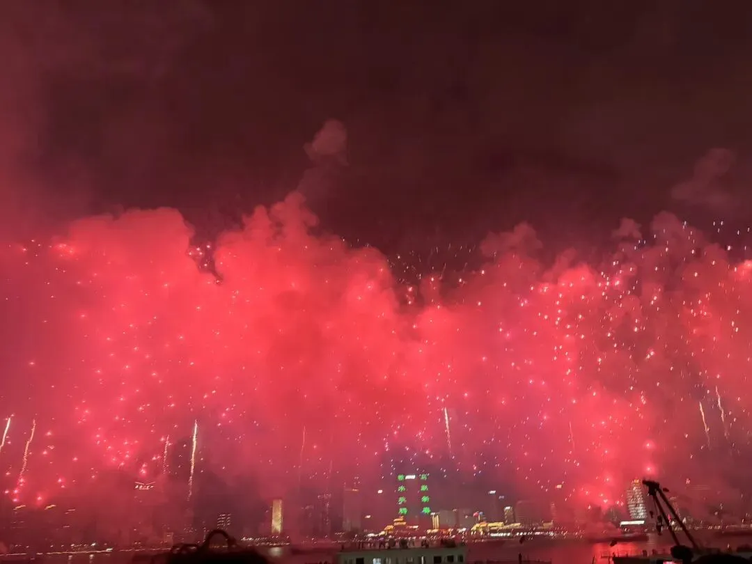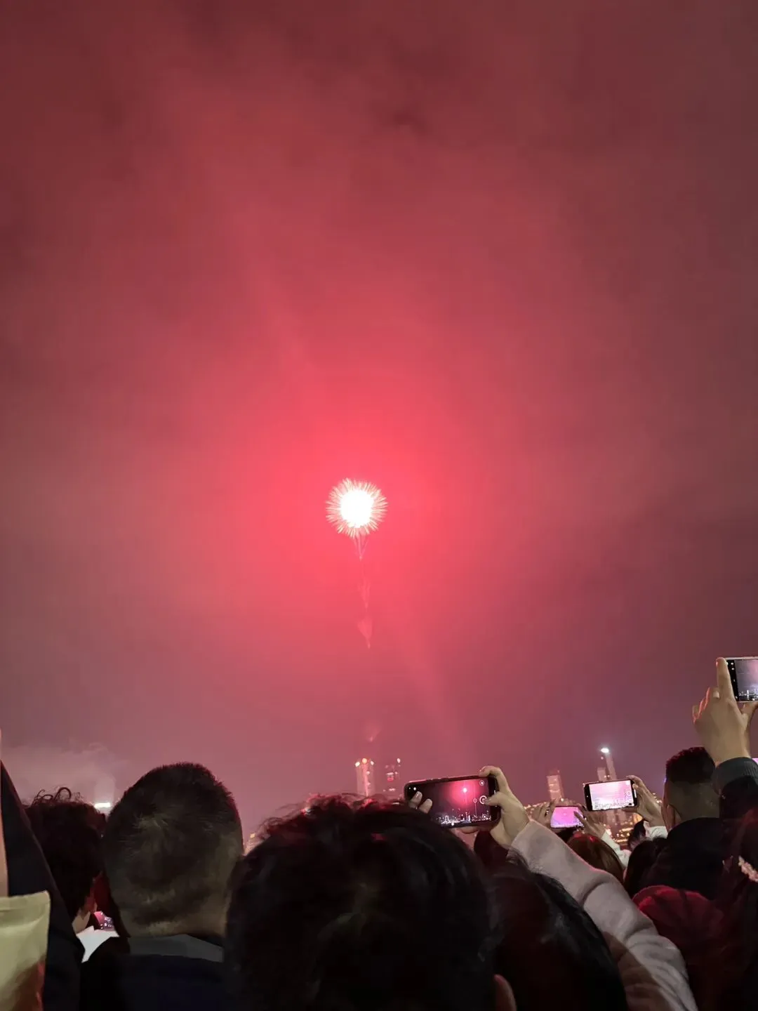 8点整烟火准时在双子塔顶点燃,第一声“咻-嘭!”划破夜空的巨响,拉开了烟火晚会的序幕。每一个人除了孩童,把手机举过头顶,拍摄烟火燃放变化的壮观时刻。随着尖叫声,欢呼声,惊叹声的此起彼伏,烟花盛开江岸上空,无限灿烂绚丽。