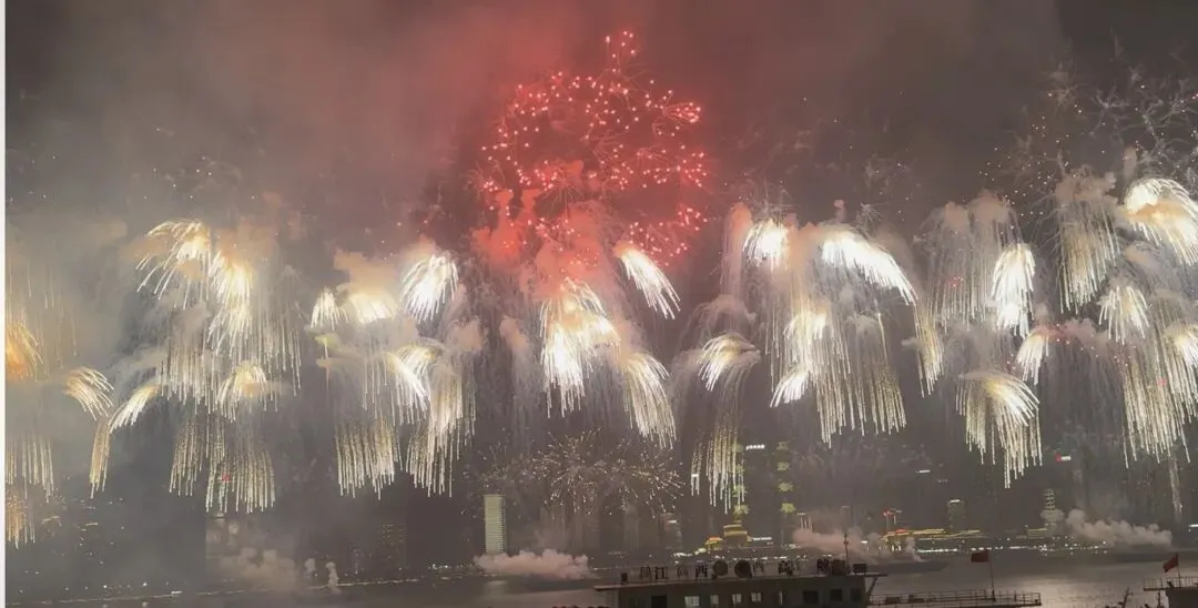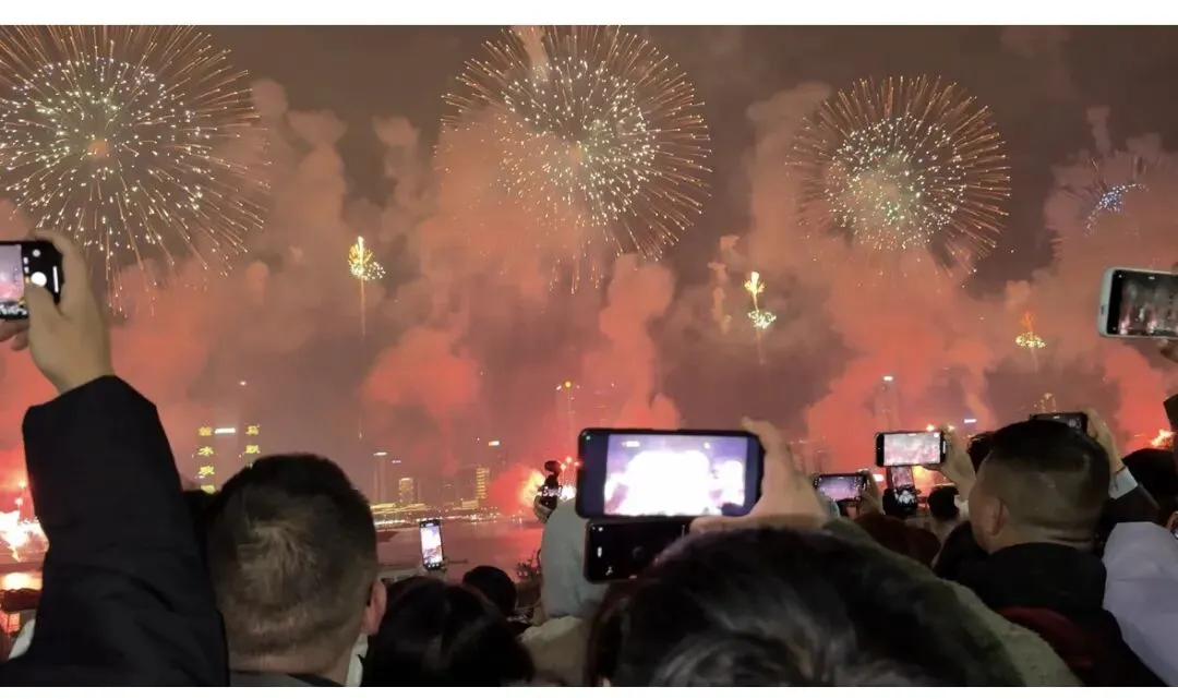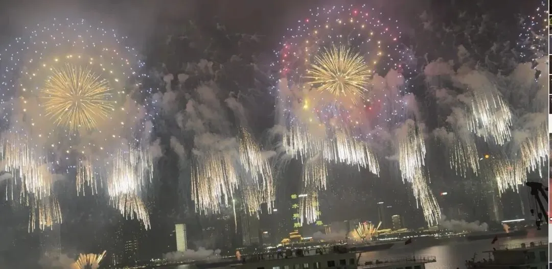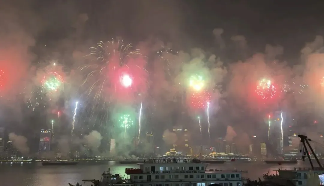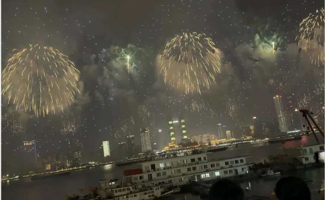 8点整烟火准时在双子塔顶点燃,第一声“咻-嘭!”划破夜空的巨响,拉开了烟火晚会的序幕。每一个人除了孩童,把手机举过头顶,拍摄烟火燃放变化的壮观时刻。随着尖叫声,欢呼声,惊叹声的此起彼伏,烟花盛开江岸上空,无限灿烂绚丽。