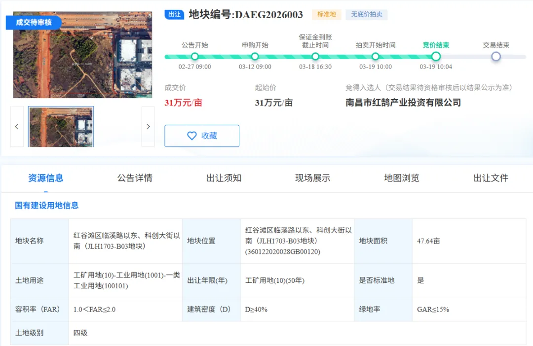 3月19日南昌红鹄产业投资有限公司正式拍下红谷滩区临溪路以东、科创大街以南(JLH1703-B03地块),该地块为红谷滩区智能制造产业基地二期项目用地,标志着这座南昌未来科学城的核心产业载体,正式迈入“一期收官、二期启幕”的接力建设新阶段。此次摘牌的二期项目地块,占地面积约47.64亩,规划总建筑面积约64500平方米,涵盖大型标准化厂房、中型生产厂房、综合服务楼,同步配套建设附属绿地、地下停车场等完善设施,项目总投资达2.54亿元。根据建设计划,二期项目将于2026年10月正式开工,2028年10月全面竣工交付。作为二期的前置支撑,产业基地一期项目(占地43.67亩,总投资约2.2亿元)坐落于本次二期地块东侧,目前已实现全部建筑主体结构封顶,正全速推进后续施工,计划2026年6月完成竣工验收。两大地块无缝衔接、梯次推进,将为红谷滩智能制造产业集聚筑牢坚实的空间基础。红谷滩区智能制造产业基地并非传统工业园区,而是南昌未来科学城发展战略中的核心物理载体与关键产业引擎,精准聚焦低空经济、商业航天、人工智能、新型显示、先进传感器等前沿新兴领域,靶向招引高精尖产业项目与科创主体落地。从产业价值来看,这座专业化智造基地是南昌培育壮大新质生产力、构建现代化产业体系的重要抓手,更是串联科创资源与实体经济、打造高标准产业集聚平台的核心载体。基地聚焦硬核科技赛道,破解产业空间碎片化难题,为前沿技术成果转化、高端产业集群落地筑牢专属承载空间。