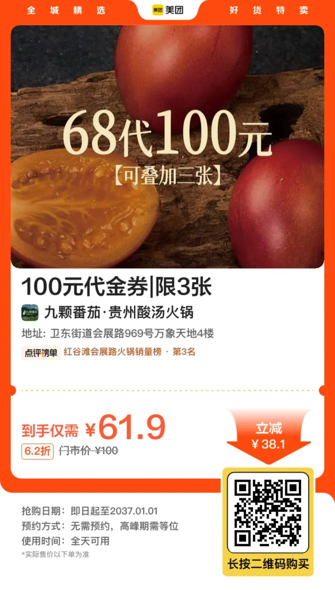 >南昌「九颗番茄·贵州酸汤火锅」优惠券:61抵100可叠加