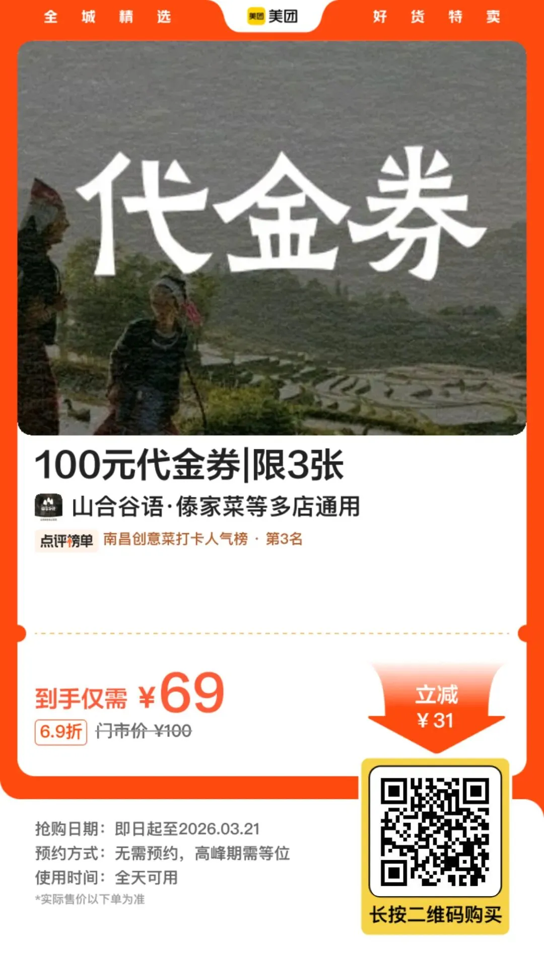 >南昌「山合谷语·傣家菜」优惠券:69抵100可叠加