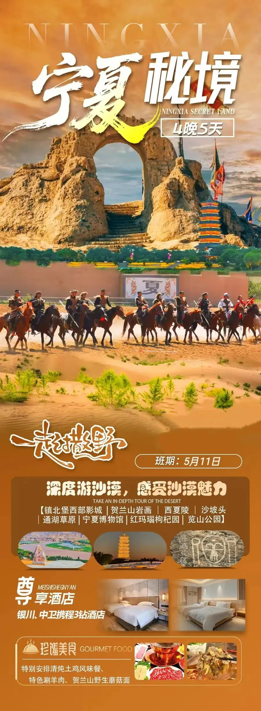 5月11-15日南昌直飞宁夏沙坡头西夏陵镇北堡西部影城贺兰山岩画通湖草原红玛瑙枸杞园览山公园宁夏博物馆双飞五日