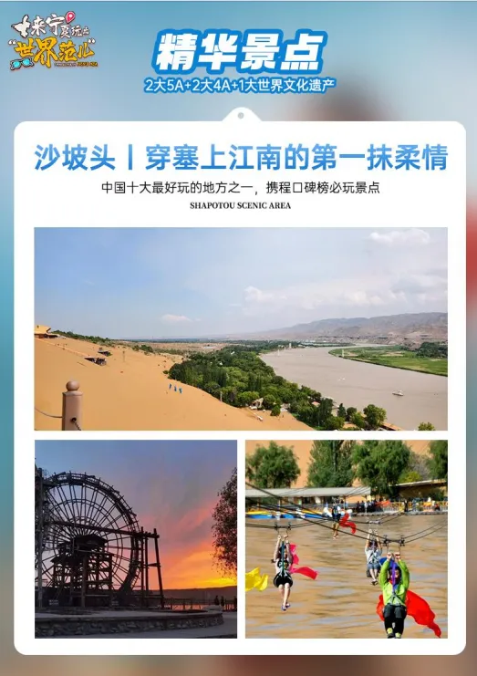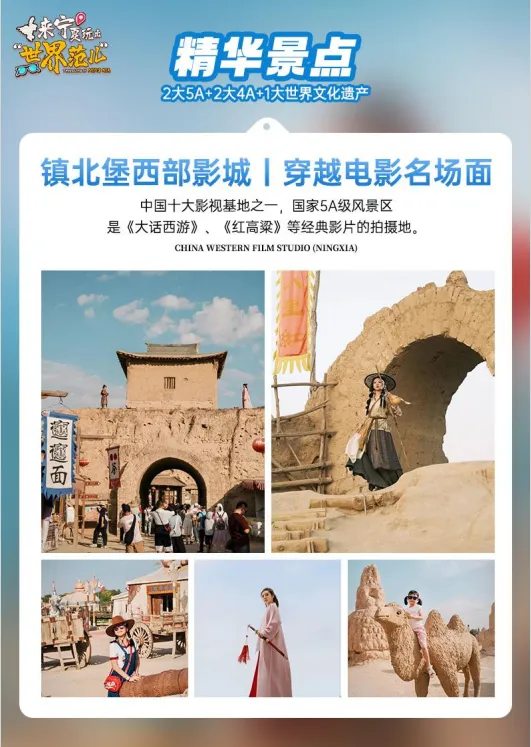 沙坡头5A、镇北堡西部影城5A、通湖草原4A;