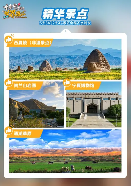酒店早餐后前往参观【宁夏博物馆】 (逢周一闭馆,参观1.5小时),中国省级综合性历史博物馆。新馆位于银川市金凤区人民广场东侧,总建筑面积 30258 平方米,全高 21.2 米,共四层。现馆藏物近四万件。其中三级以上珍 贵文物四千余件,经鉴定确认的国家一级文物 159 件。前往参观【红玛瑙枸杞园】(博物馆/红玛瑙20KM,停留约1小时)沉浸式了解宁夏“红宝”的秘密。学习辨别优劣,品尝鲜枸杞原浆,可以为家人朋友甄选最源头的健康伴手礼。前往参观【西夏陵】(红玛瑙/西夏陵15KM,含电瓶车+3D 电影,游览约3小时)在历史的长河中,有许多遗迹如璀璨星辰,默默诉说着往日的辉煌。西夏陵,就是这样一处承载着厚重历史与文化的瑰宝。2025 年7月11日,在法国巴黎召开的联合国教科文组织第47届世界遗产大会上,西夏陵成功列入《世界遗产名录》,开启了它在世界舞台上闪耀的新篇章。是中国现存规模最大、地面遗址最完整的帝王陵园之一,也是现存规模最大的一处西夏文化遗址 ,是 国家 AAAA 级景区被世人誉为“ 神秘的奇迹 ”“ 东方金字塔 ”。前往参观【览山公园】(停留约1小时)登上仿古罗马式建筑风格的露天剧场,俯瞰银川市区,是观赏塞上黄昏日落的绝佳位置。在仿古罗马剧场欣赏一场绝美的塞上日落,为旅程镀上金色滤镜。