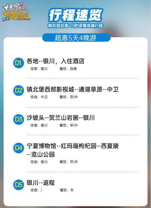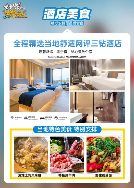 温馨提示:1、宁夏银川市地处祖国西北内陆,早晚温差较大,气候干燥,请带好合适装束,适量饮水。2、宁夏酒店入住时间一般在北京时间 14:00 以后,若您提前抵达且酒店房间未整理出来可能无法及时入住发生等候情况,给您带来不便敬请谅解。(可先寄存行李在酒店前台后自由活动)。3、舌尖上的银川:百草滩羊涮羊肉、上一冰煮羊(阅彩城店)、国强手抓(贵宾楼店)、红柳枝烧烤、阅彩城观光夜市、金凤万达广场、鼓楼商圈。4、银川市区推荐:凤凰幻城、海宝公园、阅海滑雪场、宁夏博物馆、鼓楼步行街、玉皇阁、团结路夜景。5、工作人员将在您出行前一天 20:00 前联系您,请注意查收短信或接听电话,避免耽误出行时间,祝您旅途愉快!