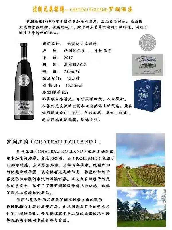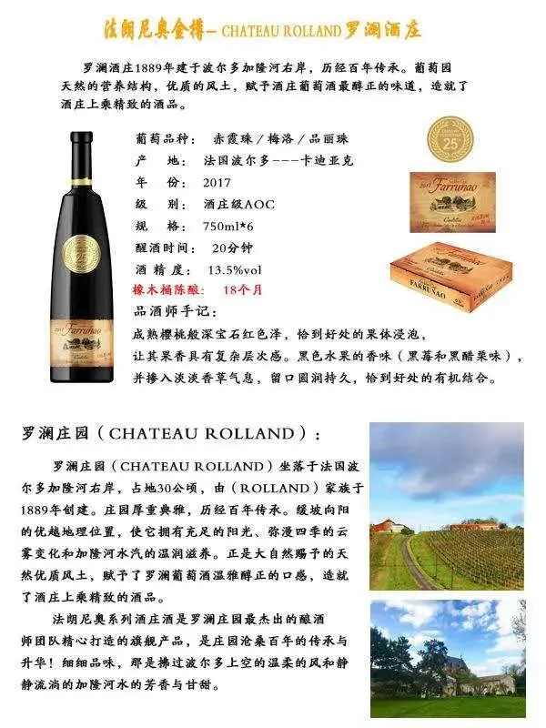 二、法国原瓶原酒进口:法郎尼奥系列干红葡萄酒产地法国波尔多--卡迪亚克;规格1件6瓶,750ml/瓶,酒精度13.5%;