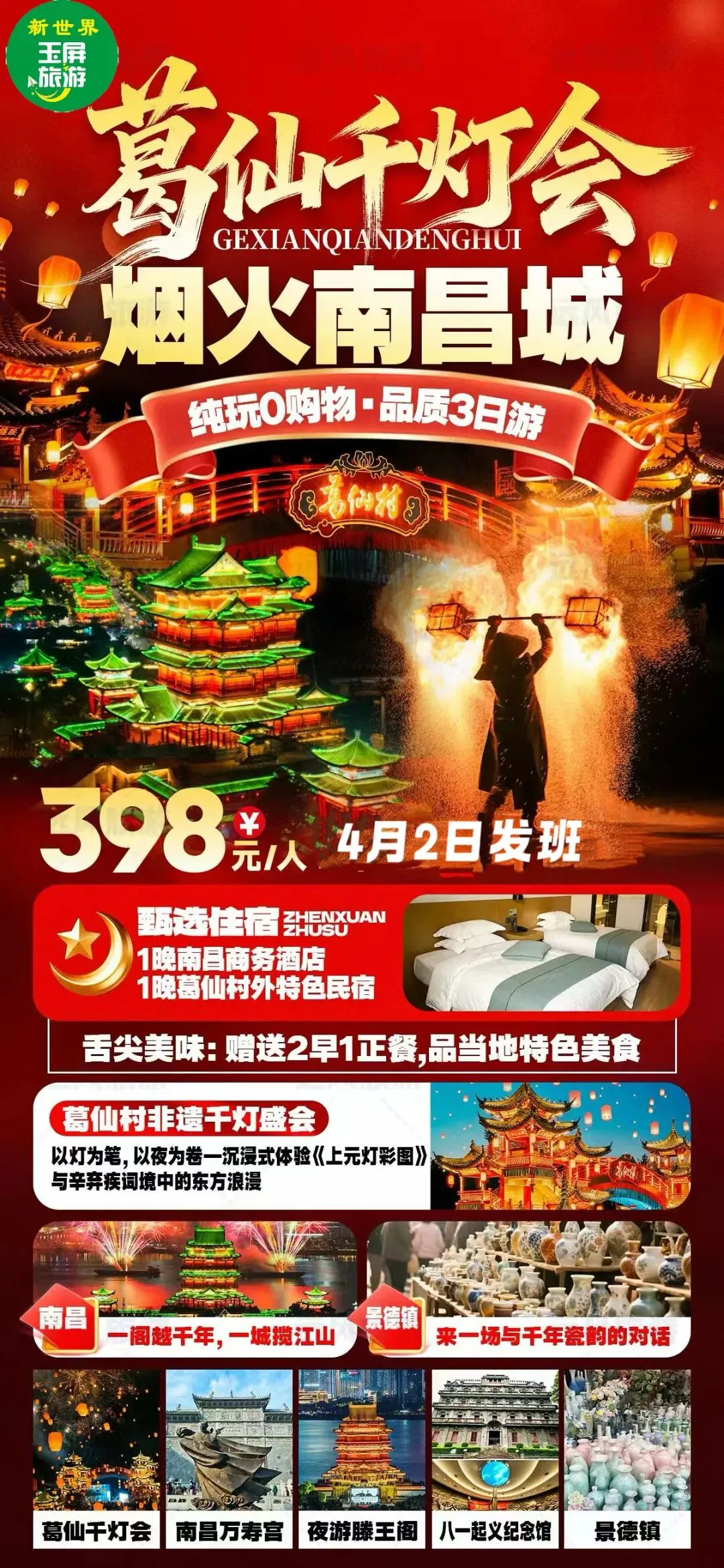【春假特刊】4月2日【葛仙千灯会·烟火南昌城!】葛仙千灯会·万寿宫·夜游滕王阁·八一起义纪念馆·景德镇(含2早1正餐)纯玩3日398元/人