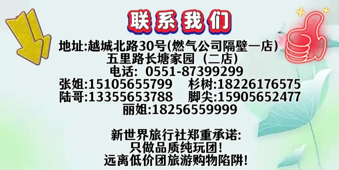 第三天早餐后,游览【景德镇雕塑瓷厂】(赠送游览,约2小时)明清园是景德镇国际陶艺中心所在地,为仿明代徽派建筑群。园内的瓷器街是景德镇古代瓷器商业街的再现,许多工艺美术大师在此设工作室,展示着巧夺天工的陶瓷雕塑技艺。每个周末早上都有瓷器集市,露天的摊,东西又多又好玩。较多搞创作的学生、艺术家以及陶艺店铺。适时结束行程,返回您温馨的家。交通:全程空调旅游巴士(临时取消请补车位损失200元/人)门票:含行程中注明的景区第一道大门票(旅行社优惠打包价,门票无任何优惠减免)1、自理:葛仙村景区门票+景交车+往返索道+综合服务费=160元(必须自理,报名时交于旅行社)2、用餐:行程中未包含的正餐,请自理(导游可代订)4、除景点第一大门票外的二次消费(如索道、娱乐项目、请香等),请游客自愿选择。1、联系下方业务经理,并加微信咨询;