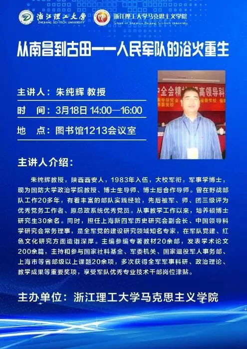 3月18日下午,《从南昌到古田——人民军队的浴火重生》讲座在浙江理工大学红色文化研究院顺利举办。本次讲座由国防大学朱纯辉教授主讲。由马克思主义学院副院长王艳娟主持,红色文化研究院院长渠长根、马克思主义学院副院长(主持工作)贺俊杰及30余位本科生、研究生参与。