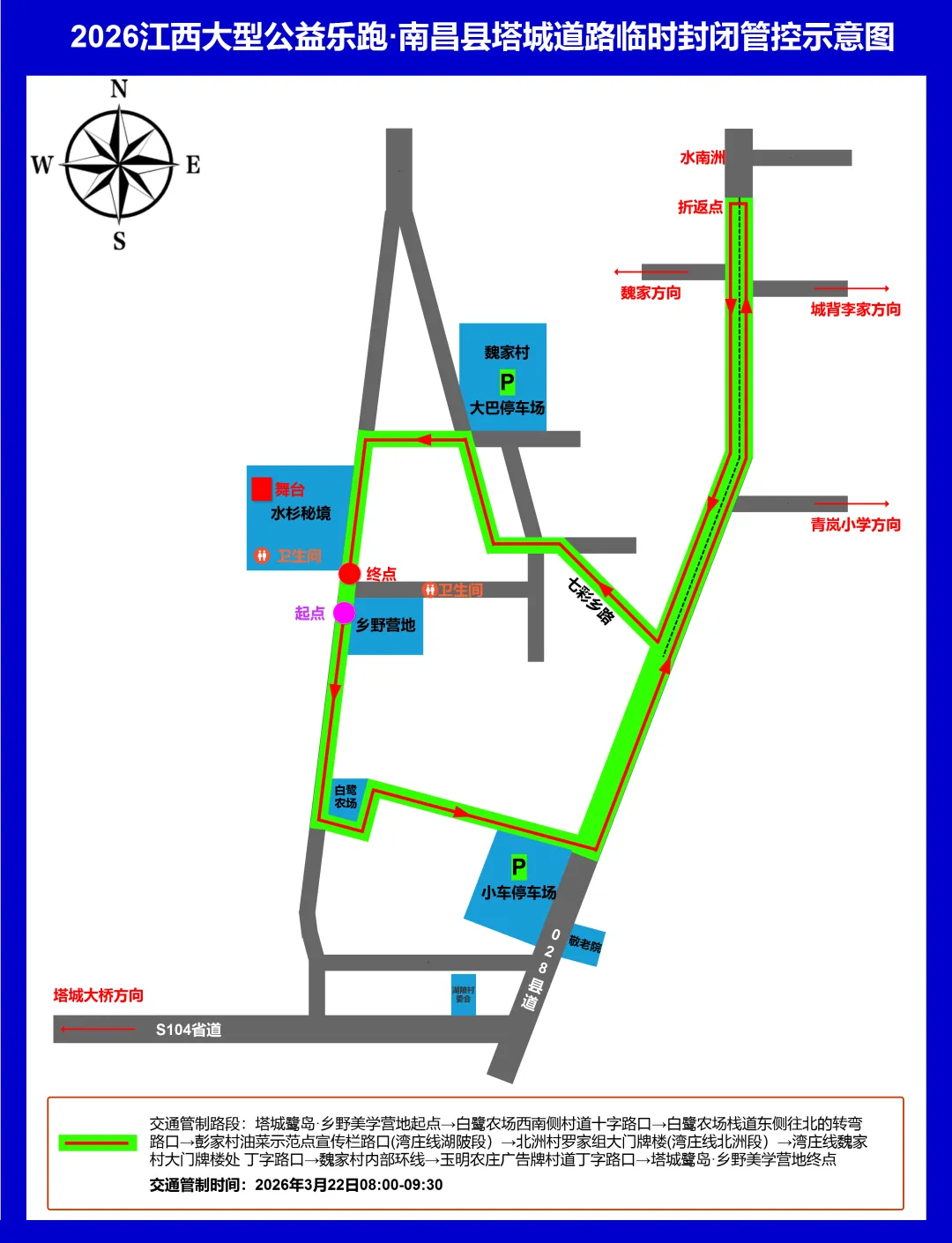 关于2026江西大型公益乐跑·南昌县塔城站活动期间道路临时封闭管控的通告为确保2026江西大型公益乐跑·南昌县塔城站活动安全、顺利举行,保障道路安全、畅通、有序,依据《中华人民共和国道路交通安全法》第三十九条等法律法规规定,决定于2026年3月22日(星期日)上午8:00—9:30,对南昌县塔城乡部分区域、道路实施临时性交通管制措施,现将有关事项通告如下: