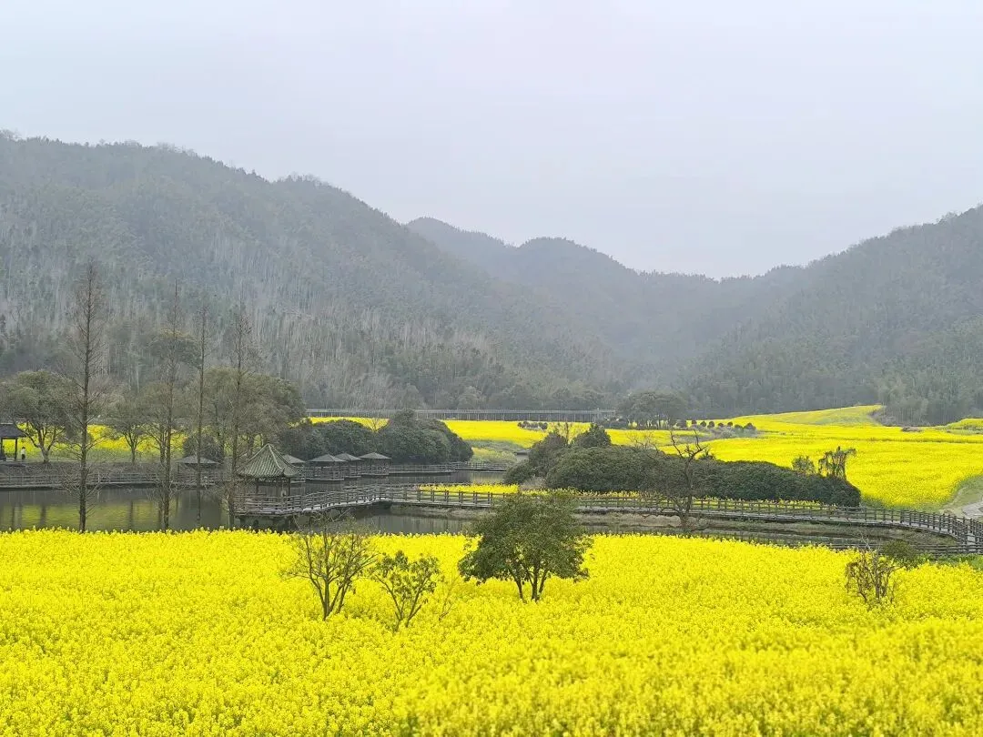 每到春季,狮子峰最令人惊艳的便是山脚下连片绽放的油菜花海。景区内500余亩梯田油菜花沿湖畔、山脚、长廊次第铺开,漫山遍野一片金黄,在春风中轻轻摇曳,与青山、绿水、白墙黛瓦的村落相映成趣,构成了江南春日最美的田园图景。油菜花海盛花期集中在3月中旬,清晨薄雾缭绕之时,花海朦胧诗意;傍晚暖光洒落之际,花色明艳温暖,是摄影与踏青的最佳时机。