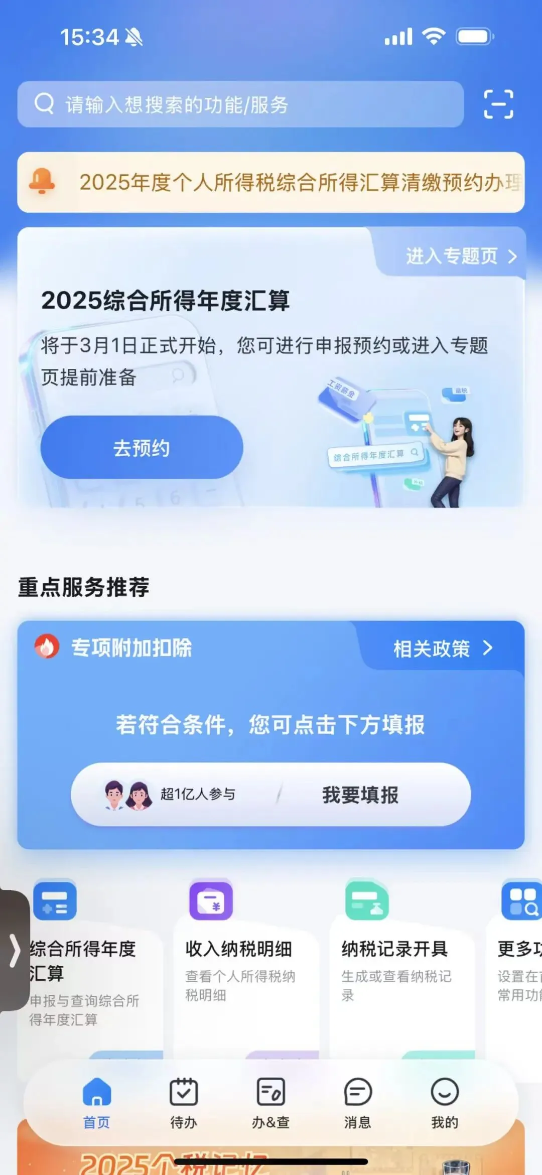 打开个人所得税APP,首页点击【综合所得年度汇算】或【我要办税】-【税费申报】-【综合所得年度汇算】。选择申报年度为2025年度。