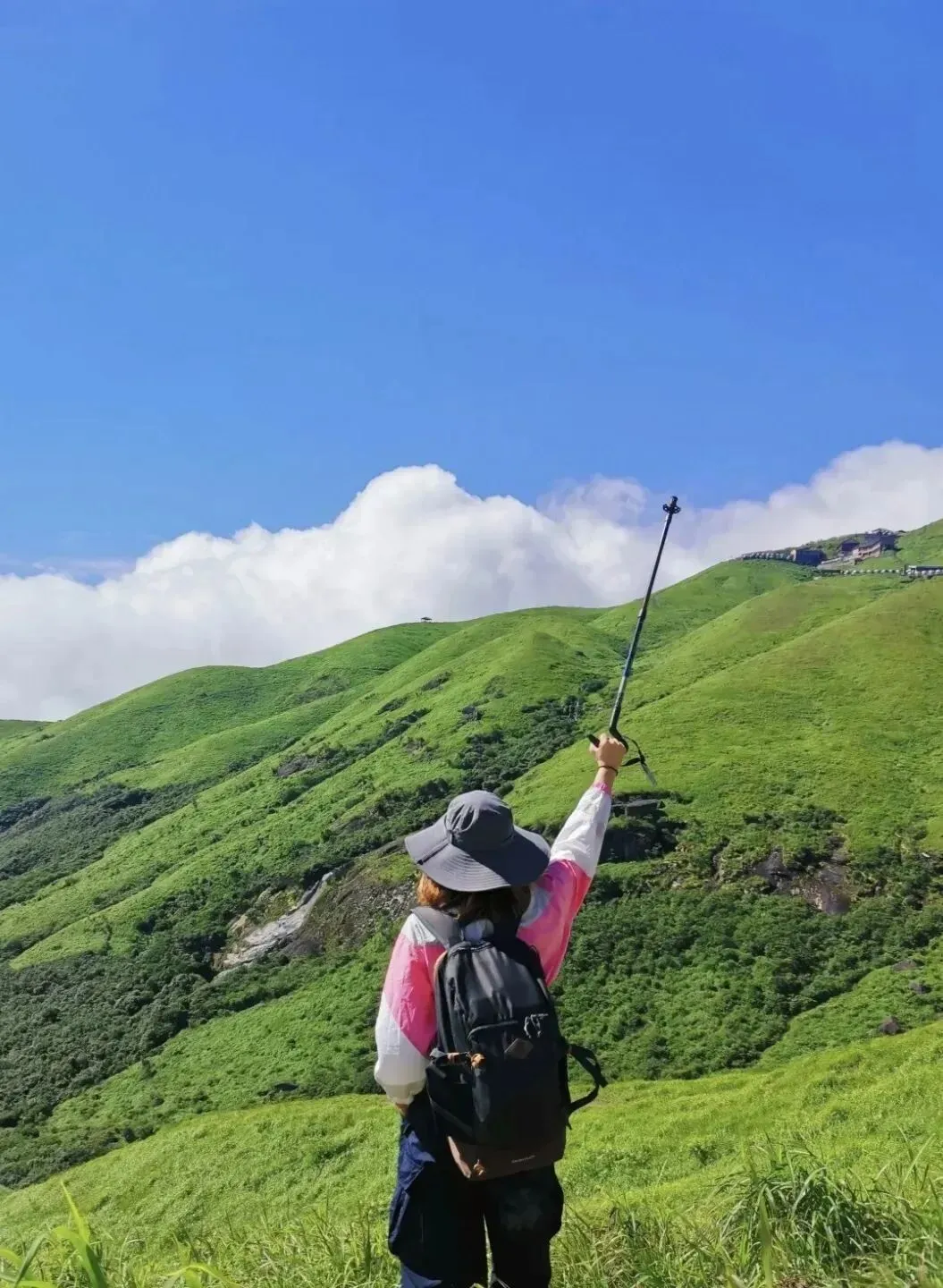 武功山的草甸是其独特的魅力所在。广袤无垠的草甸仿佛给群山披上了绿色的地毯,微风拂过,草丛随风起伏,如波浪般翻滚,沙沙作响,仿佛在诉说着大自然的故事。草香扑鼻,让人心旷神怡,登山的疲惫也在这一刻消散殆尽。