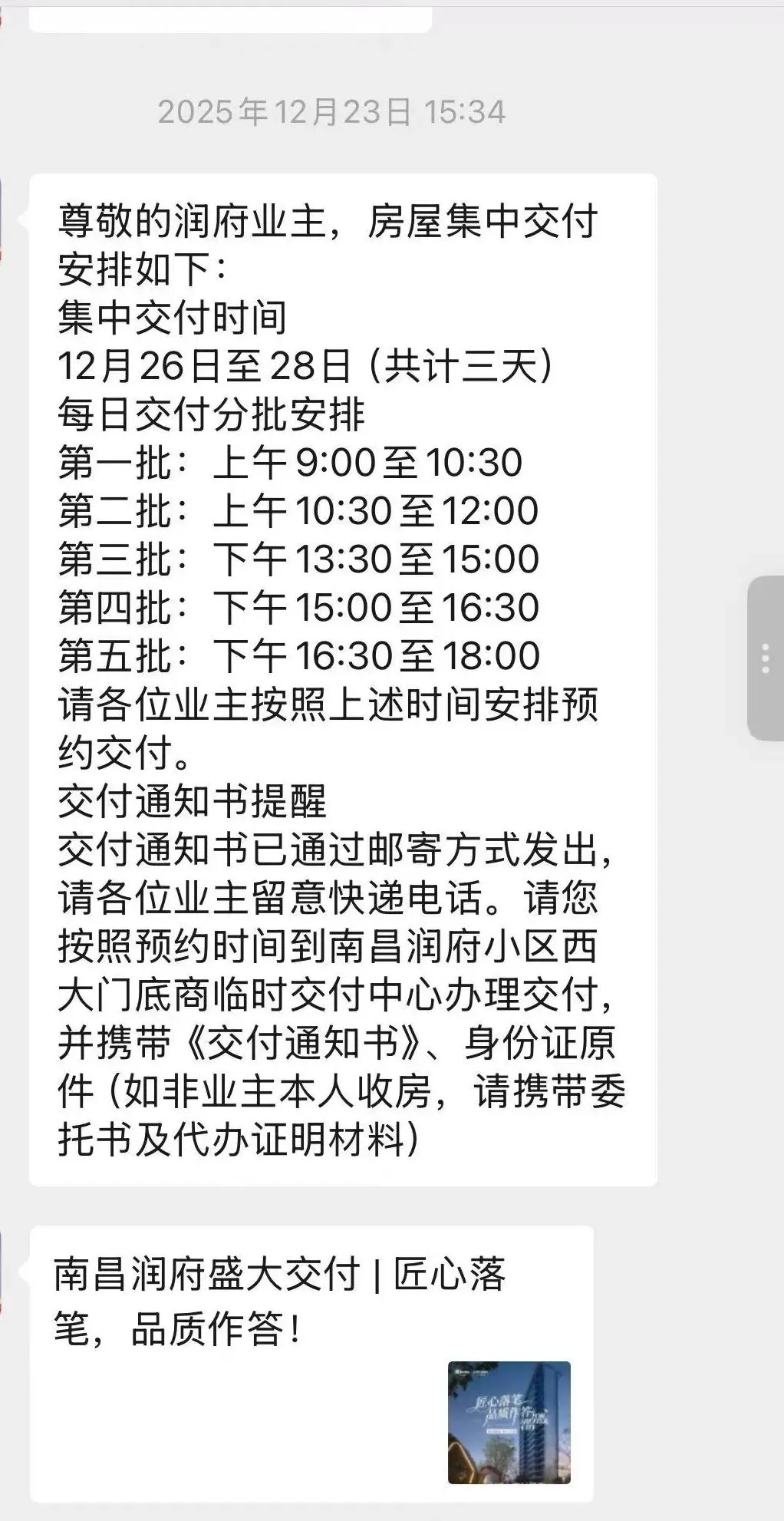 据黄先生介绍,他于2025年10月底至11月初购买了该小区10栋2单元的一套房产。2025年12月23日,他收到小区物业发出的收房通知,告知其可在12月26日至28日期间办理收房手续。因春节期间事务繁忙,他未能按时前往,直至2026年3月中旬才备齐材料,到小区物业办理收房。12月23日,工作人员通知业主收房时间