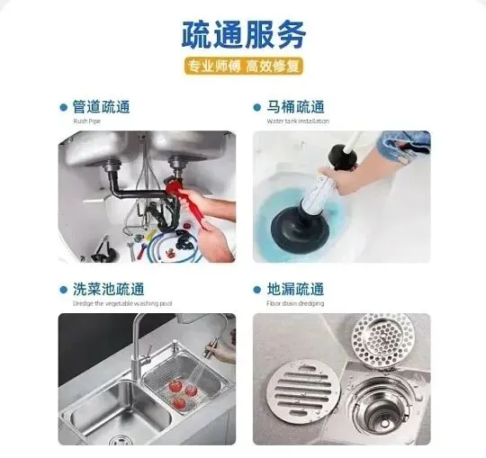 疏通下水道、马桶、蹲厕、地漏;疏通下水管;维修马桶漏水;维修水管;卫生间除臭、反味处理;脸盆、菜盆疏通;疏通墩布池;通坐便、蹲便、小便池;除尿碱;疏通主管道、疑难管道;高压清洗、抽粪服务;上下水管安装、改管、维修。