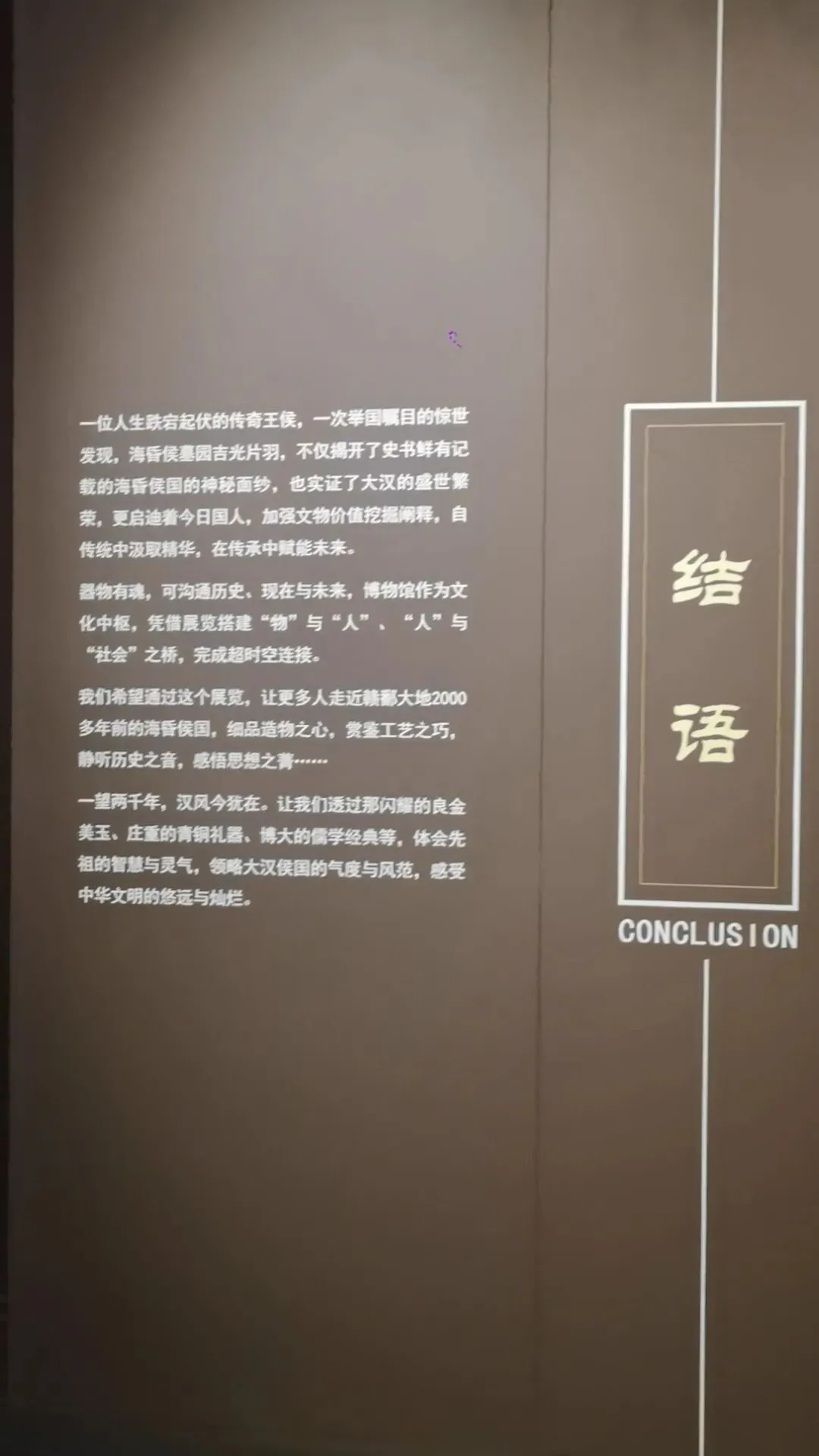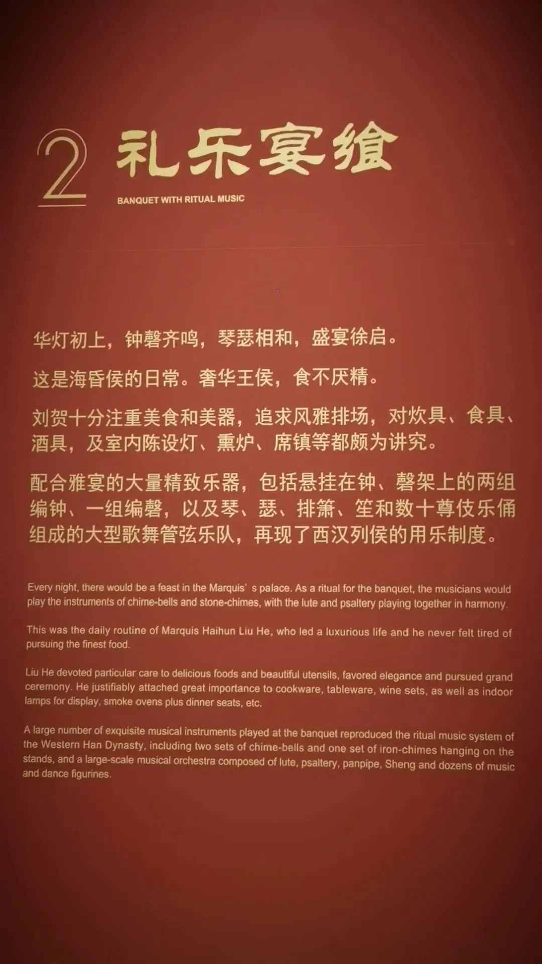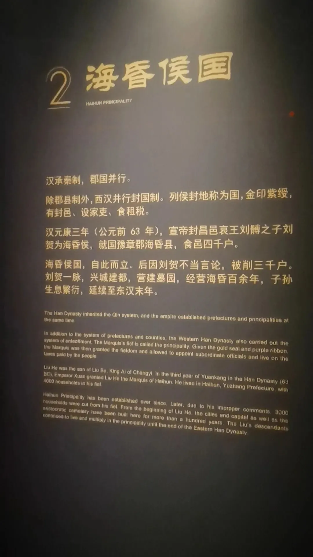 位置:园区大门两侧;仿汉代海昏紫金城阙楼,阙身装饰汉代龙、凤、云气纹样,是入园第一道标志性景观。购票可以在网上购买,如果不需要乘坐观光车的,就不需要进游客中心了,直接在游客中心正门左侧有个小路直接可以步行前往海昏侯博物馆,步行大约2公里时间20分钟左右,不行其实挺好的,一路走走还可以看看路上的风景这对神兽为汉代典型的天禄、辟邪(也被视作瑞兽/镇墓兽),造型源自海昏侯墓出土的神兽玉饰与铜当卢纹样,是汉代贵族用以驱邪避凶、守护陵寝与侯国威仪的象征。刘贺(前92—前59年),汉武帝之孙,昌邑王刘髆之子;墓中出土的「刘贺」玉印是确认墓主身份的铁证第一代海昏侯、西汉废帝刘贺的青铜立像;序厅中央高台上,背后是巨幅铜版画,讲述其「王—帝—民—侯」的跌宕人生;无真人容貌存世,为参考汉代服饰、文献记载+艺术创作的形象这枚和田白玉质地的印章是海昏侯墓的核心镇馆之宝,也是确认墓主身份的铁证。它出土于主棺内刘贺遗骸腰部,印面阴刻篆书“刘贺”二字,印纽为高浮雕螭龙,既符合汉代“方寸之印”的规制,又以螭龙暗合其皇族身份。作为汉印艺术的典范,它不仅见证了刘贺“王—帝—侯”的跌宕人生,更印证了西汉丝绸之路的玉料流通与大汉文明的工艺高度,现展于南昌汉代海昏侯国遗址博物馆主馆核心展厅。两千多年前,他用最规整的汉隶,写下向朝廷请安、缴纳酎金的公文,字里行间满是侯国对皇权的恭敬。它是目前发现的等级最高的汉代公文原本,每一道木纹、每一笔隶书,都在诉说着大汉的礼仪与秩序,也见证了刘贺跌宕的一生。今天,它静静躺在海昏侯博物馆,等着我们读懂那段被时光封存的历史海昏侯墓历经这么长时间,没被盗掘一个很重要的原因就是它一直存在于湖底下刘贺墓西侧的真车马陪葬坑,是长江以南地区首次发现的汉代王侯级真车马坑,陪葬有5辆独辀安车、20匹马,代表了汉代王侯出行最高等级的“驷马高车”。墓中车马库还出土2辆军礼性质的模型乐车、6辆轺车及御车木俑,其中乐车配备青铜錞于、青铜铙、钟和建鼓,这种“金车”与“鼓车”搭配的西汉列侯豪华马车,为国内首次发现。车马上的装饰物工艺繁复华美,彰显了汉代王侯的尊贵身份。刘贺十分注重美食与美器,对炊具、食具、酒具,以及室内陈设的灯具、熏炉、席镇等均颇为讲究。墓中出土了大量配合雅宴的精致乐器,包括两组编钟、一组编磬,以及琴、瑟、排箫、笙和数十尊伎乐俑组成的大型歌舞管弦乐队,直观再现了西汉列侯的用乐制度与风雅排场。西汉视黄金为上币,流通饼形金、金钣、褭蹏金、麟趾金等,皇帝赏赐功臣动辄赐金上万。海昏侯刘贺墓出土黄金器物478件(含饼形金、褭蹏金、麟趾金、金钣),合计115公斤;其子刘充国墓亦出土褭蹏金2件,这是迄今中国汉墓考古发现黄金数量最多的一次,见证了西汉“黄金时代”的繁荣。此外,墓中还出土十余吨五铢钱币,堆积如山,实证了刘贺的巨额财富。这是南昌汉代海昏侯国遗址博物馆展示的孔子像漆衣镜出土现场图,这件文物是目前已知最早的孔子形象实物。它出土于海昏侯刘贺墓主椁室,镜背绘有孔子及其弟子像,并附有人物传记文字,是西汉“独尊儒术”背景下的重要物证,也为研究汉代服饰、绘画与思想文化提供了珍贵资料。因原件仍在修复中,馆内多以复制品展出。这里是一些互动的,其中感觉这个投壶还是比较有意思的海昏侯墓出土漆器以红黑为基调,点缀黄、白、褐、绿、金、银等色,画面灵动多彩,生动描绘山川云气、神怪仙兽与社会生活;装饰技艺涵盖素髹、彩绘、釦器、贴金、锥画、镶嵌等,尽显汉代匠人巧思。器物上的书刻文字浑厚高古,尽显隶书风骨,既体现了漆器“坚牢于质,光彩于文”的特质,也完整呈现了西汉髹漆工艺的高超水平。出口地方,有相关的纪念钞自助购买,会经过一个很大的文创店,可以购买海昏侯相关的文创品