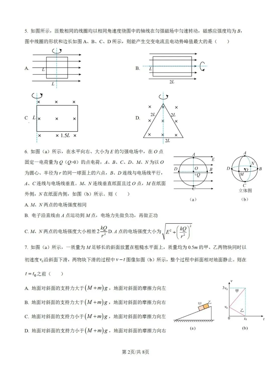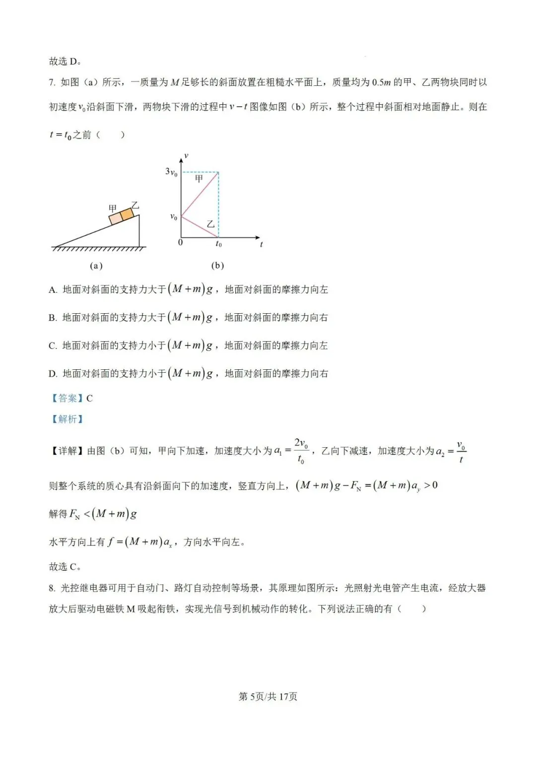 - 第7题结合运动学图像(v-t图)分析整体受力,要求通过斜面与滑块的动力学推理对地面对斜面支持力、摩擦力进行判断。