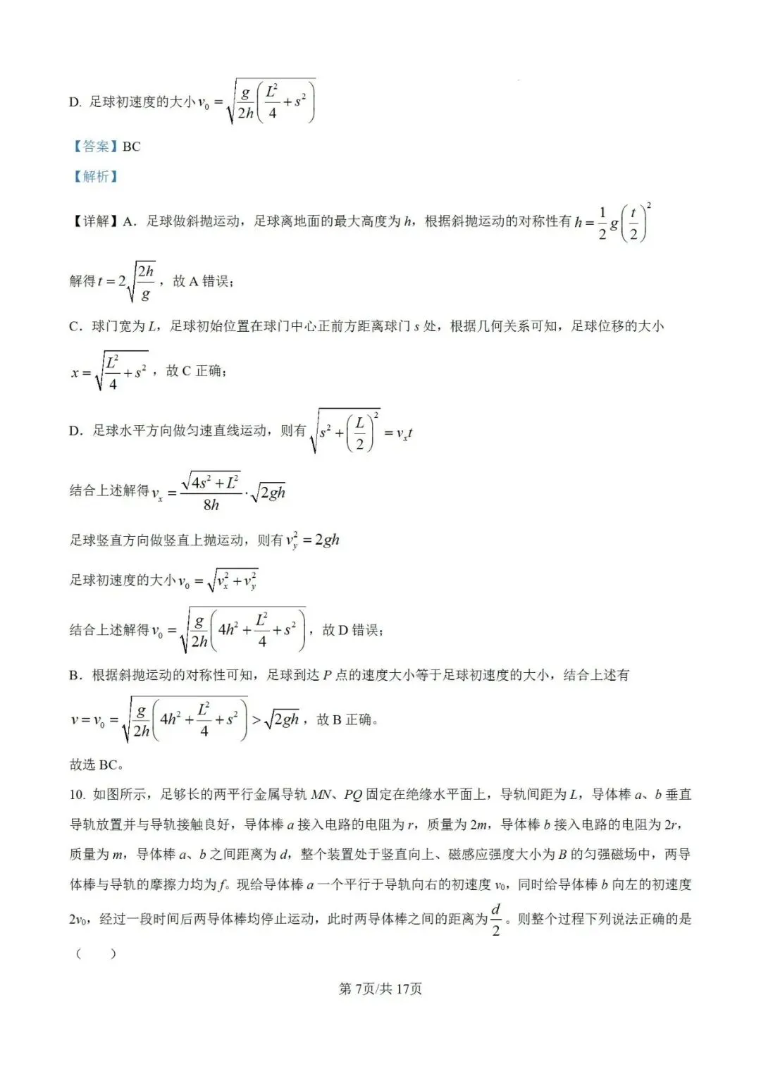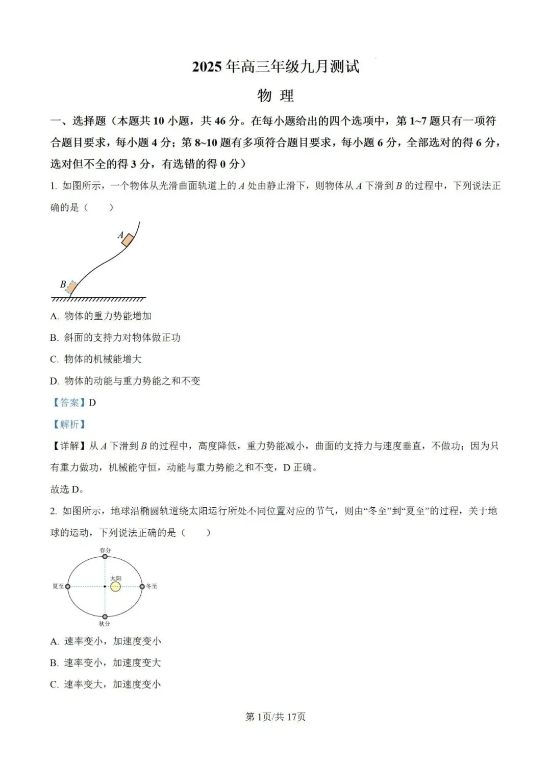 - 难度梯度清晰:前7题注重基础概念和模型的理解,例如第1题中光滑曲面轨道的能量守恒、第2题万有引力与椭圆轨道参数关系的辨析;8~10题强调多变量分析(如光电效应、斜抛运动、双棒电磁感应),要求学生灵活掌握知识的综合应用。