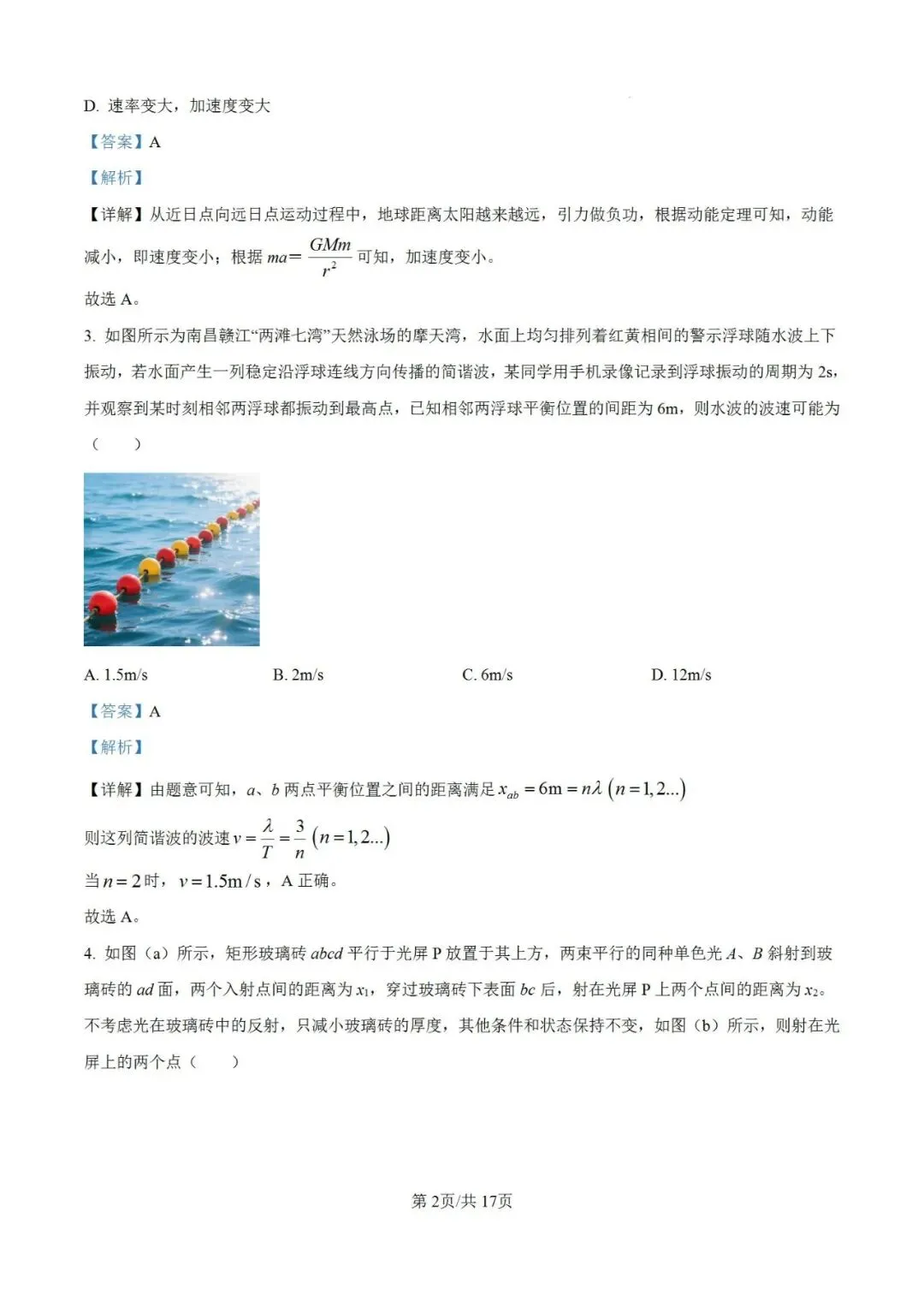 - 第3题引入实际情境(赣江警示浮球与水波),将简谐波波长、周期与波速关系的抽象规律置于具体问题,提升应用能力。