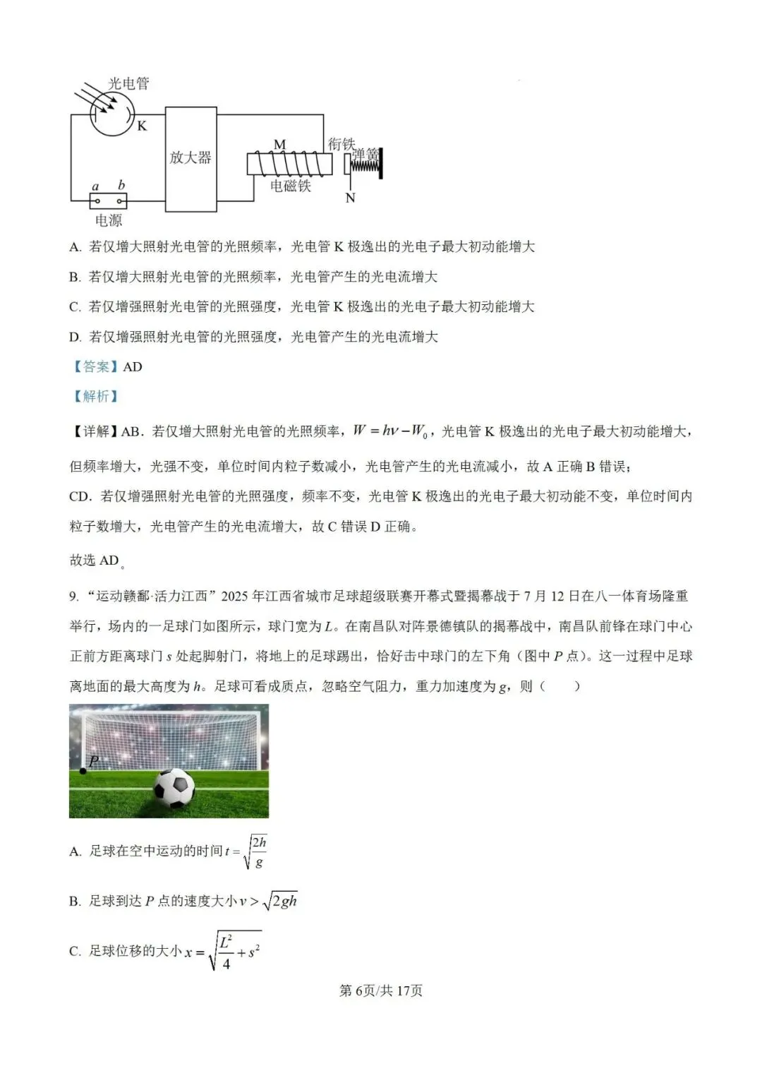 - 第9题以“足球超级联赛”为背景设计斜抛运动物理模型,与生活结合,增强题目趣味性和现实意义。